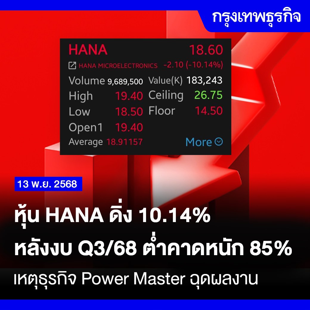 หุ้น HANA ดิ่ง 10.14%หลังงบ Q3/68 ต่ำคาดหนัก 85% เหตุธุรกิจ Power Master ฉุดผลงาน
