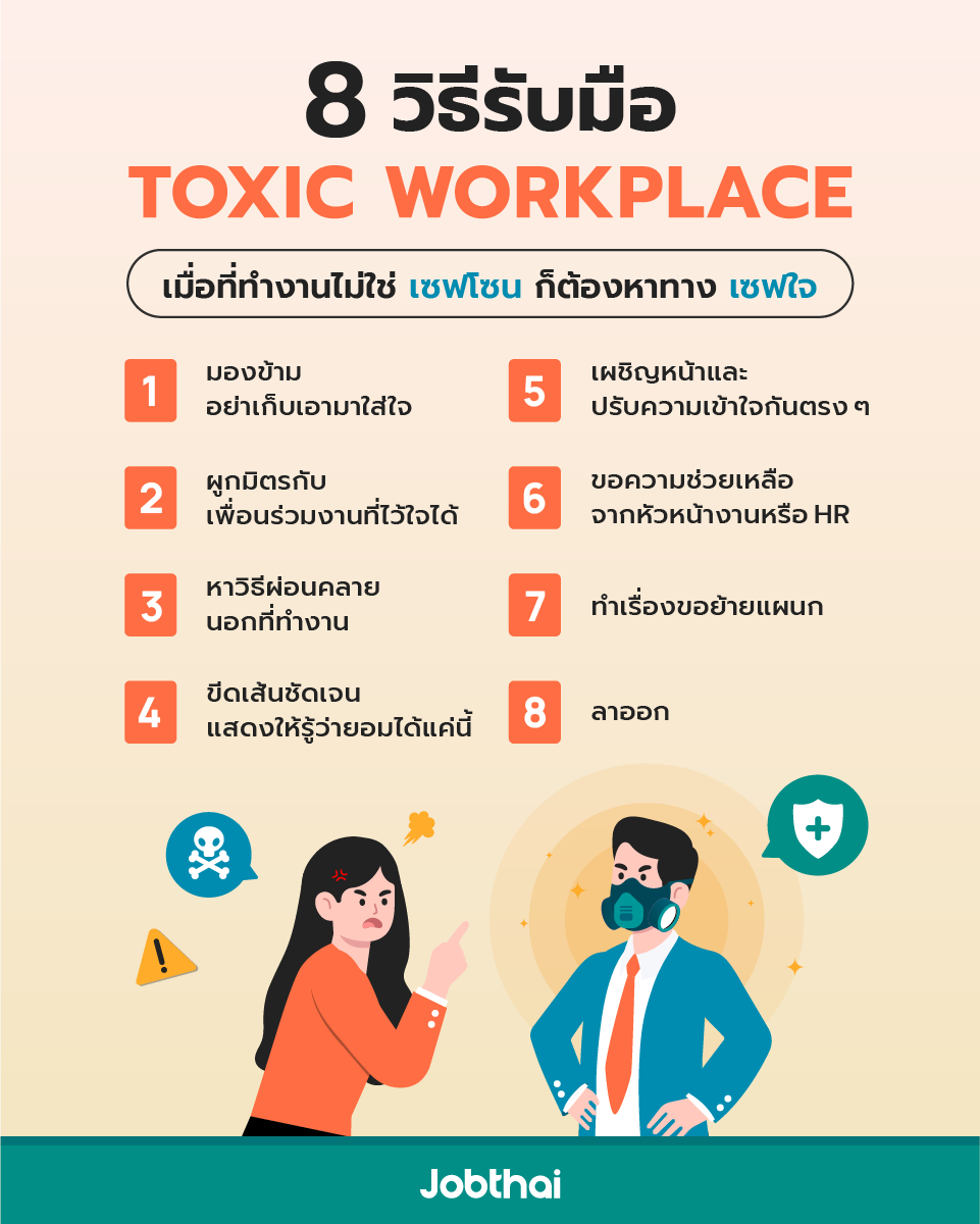 เมื่อออฟฟิศไม่ใช่ Safe Zone แต่เป็นแหล่งเพาะพิษร้ายที่บั่นทอนจิตใจของเรา[img]https://static.xx.fbcdn.net/images/emoji.php/v9/t30/1/16/1f635.png[/img] ทุกวันที่ไปทำงาน เราต้องเจอกับบรรยากาศแย่ ๆ ที่ทำให้รู้สึกไม่ดี เช่น เพื่อนร่วมงานชอบซุบซิบนินทา หรือหัวหน้างานชอบใช้อำนาจในทางที่ผิด เราก็ต้องสวมเกราะแล้วหาทางปกป้องตัวเอง JobThai มี 8 วิธีรับมือกับ Toxic Workplace หรือสภาพแวดล้อมการทำงานที่เป็นพิษมาฝาก