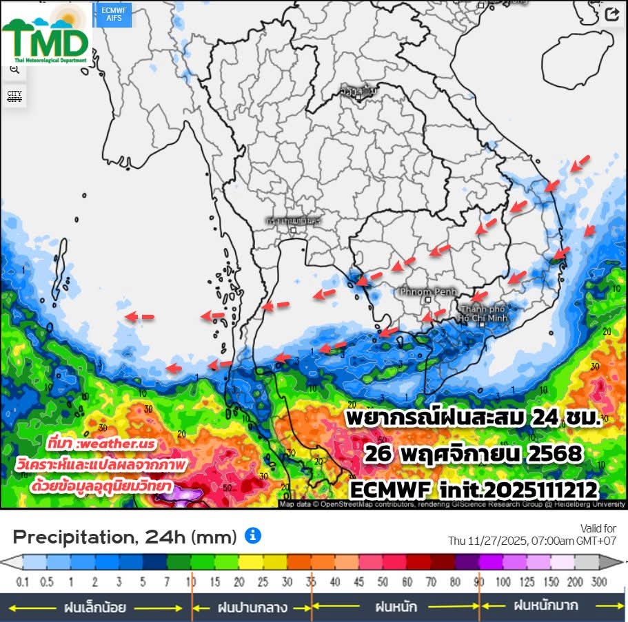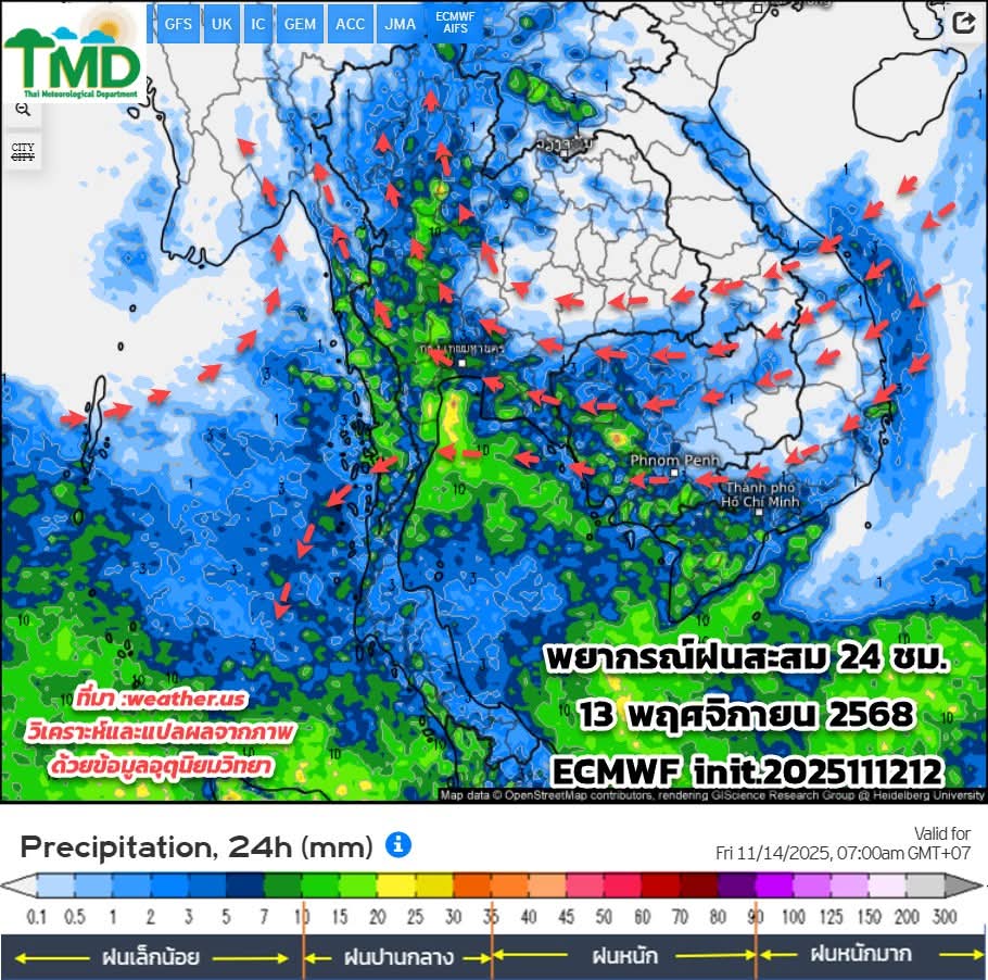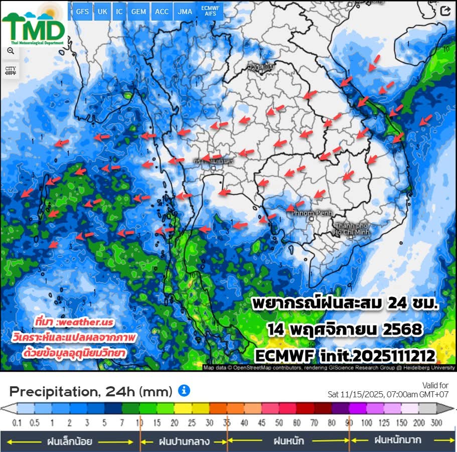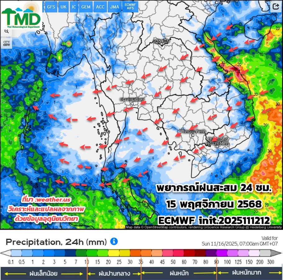 พยากรณ์ฝนสะสมรายวัน 15 วัน ไทยตอนบนฝนลดลงแต่ยังมี อากาศเย็นมาแทน ใต้ฝนเพิ่มขึ้น