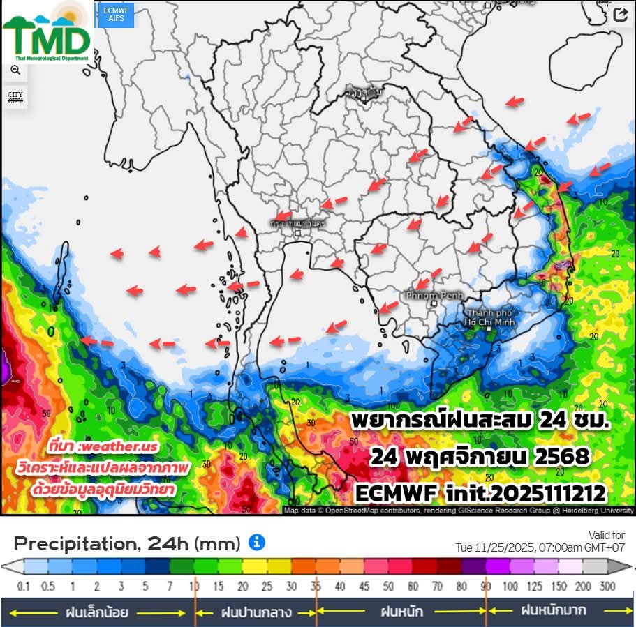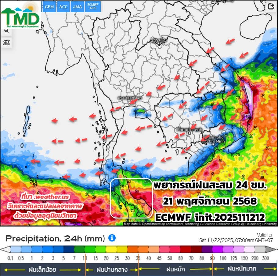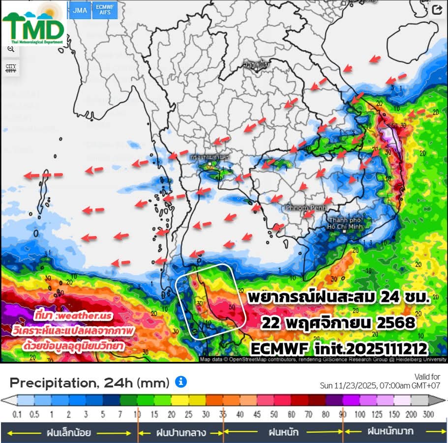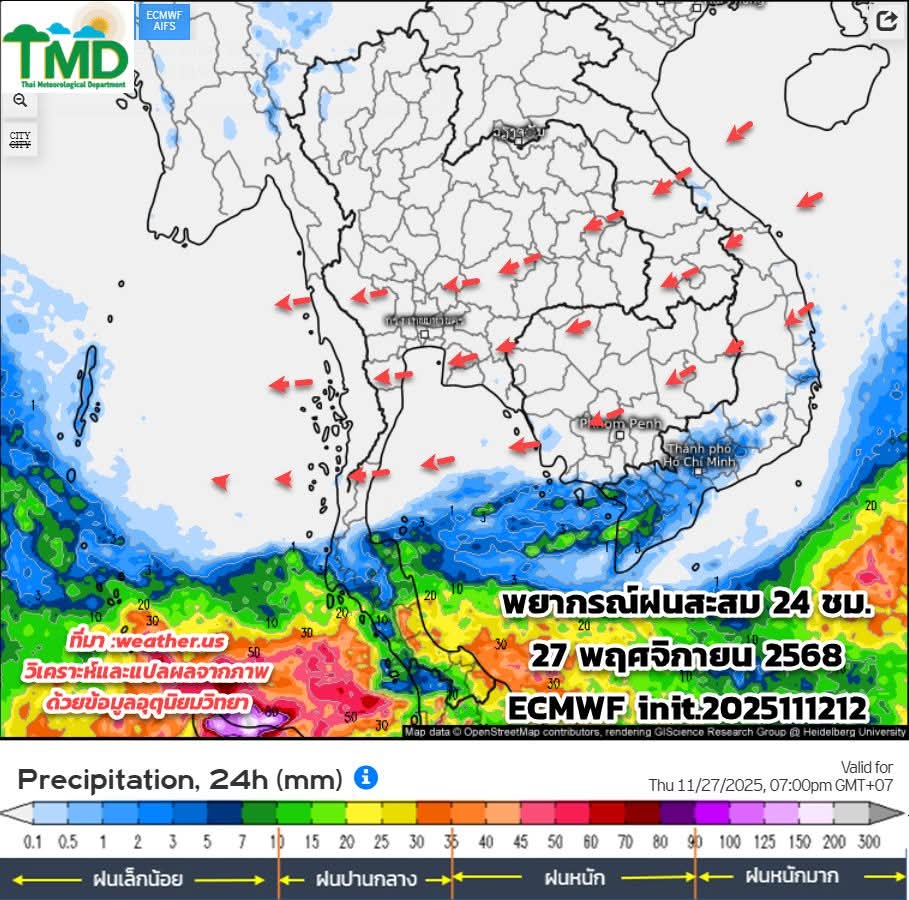 พยากรณ์ฝนสะสมรายวัน 15 วัน ไทยตอนบนฝนลดลงแต่ยังมี อากาศเย็นมาแทน ใต้ฝนเพิ่มขึ้น