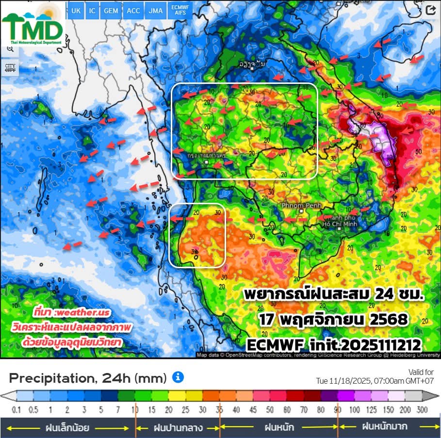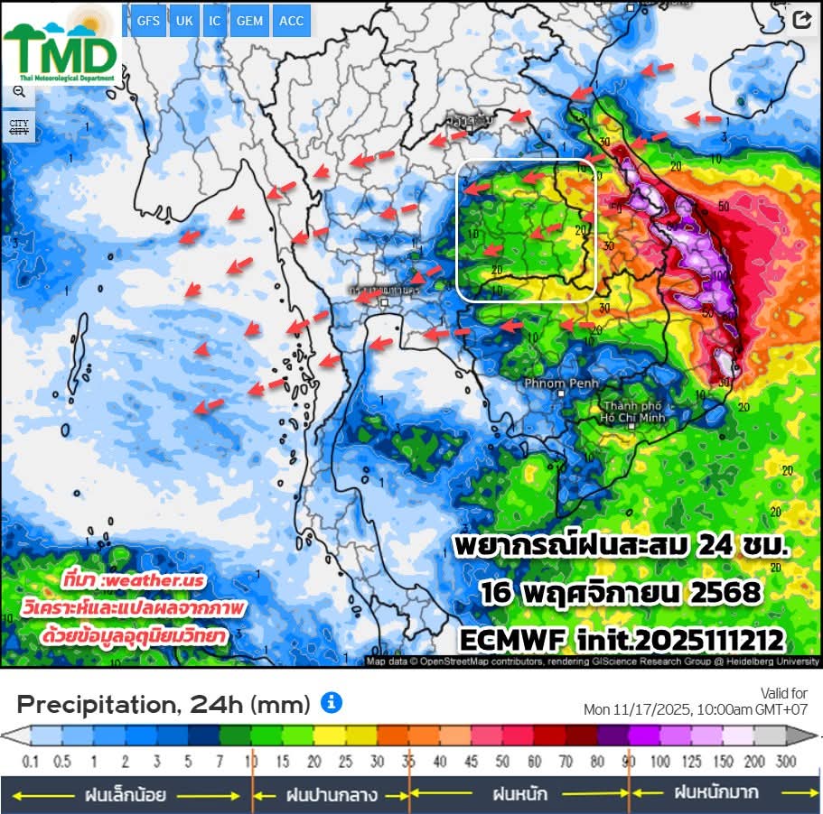 แต่ยังมีช่วง16-18พ.ย.68 อาจจะมีฝนเพิ่มขึ้นได้ บริเวณภาคอีสานตอนล่าง ภาคกลางตอนล่าง ภาคตะวันออก กทม.และปริมณฑล เนื่องจากมีคลื่นกระแสลมฝ่ายตะวันออก (ลมระดับ500 hPa) ต้องระวังรักษาสุขภาพช่วงที่อากาศเปลี่ยนแปลง