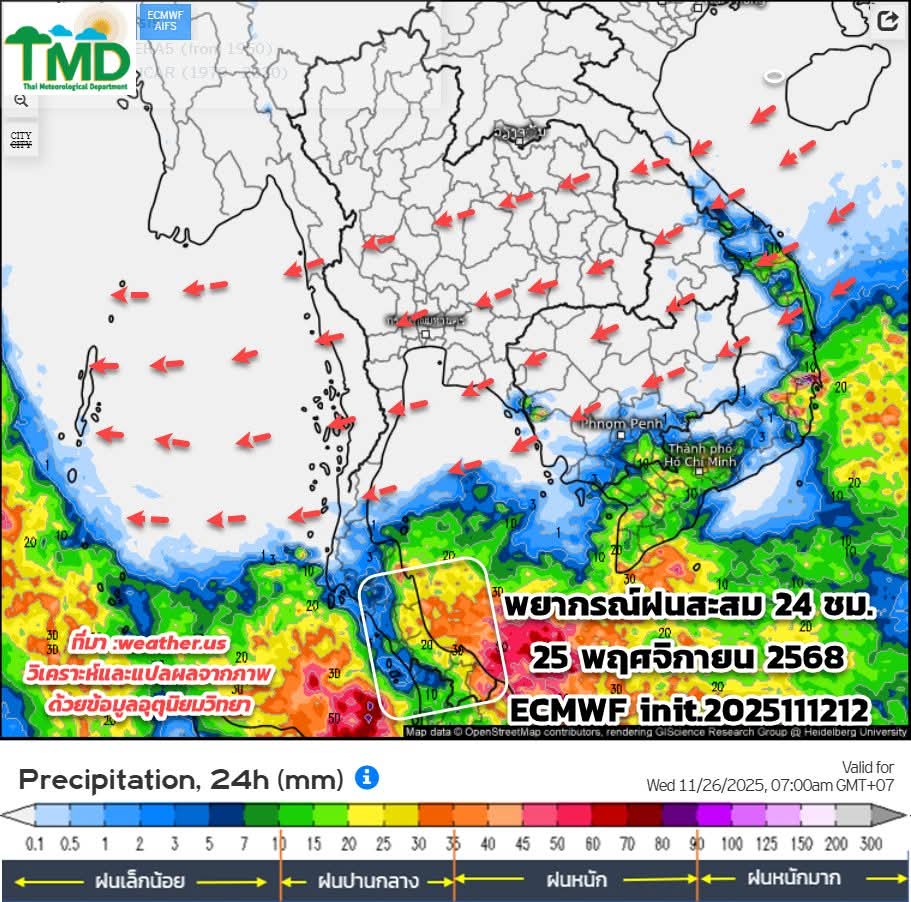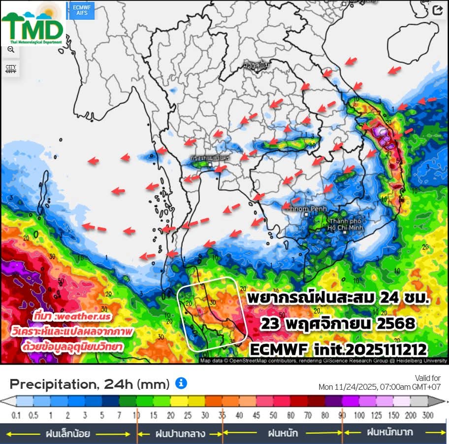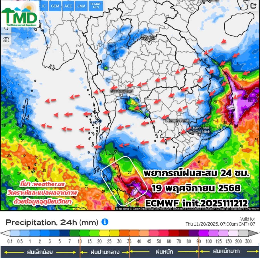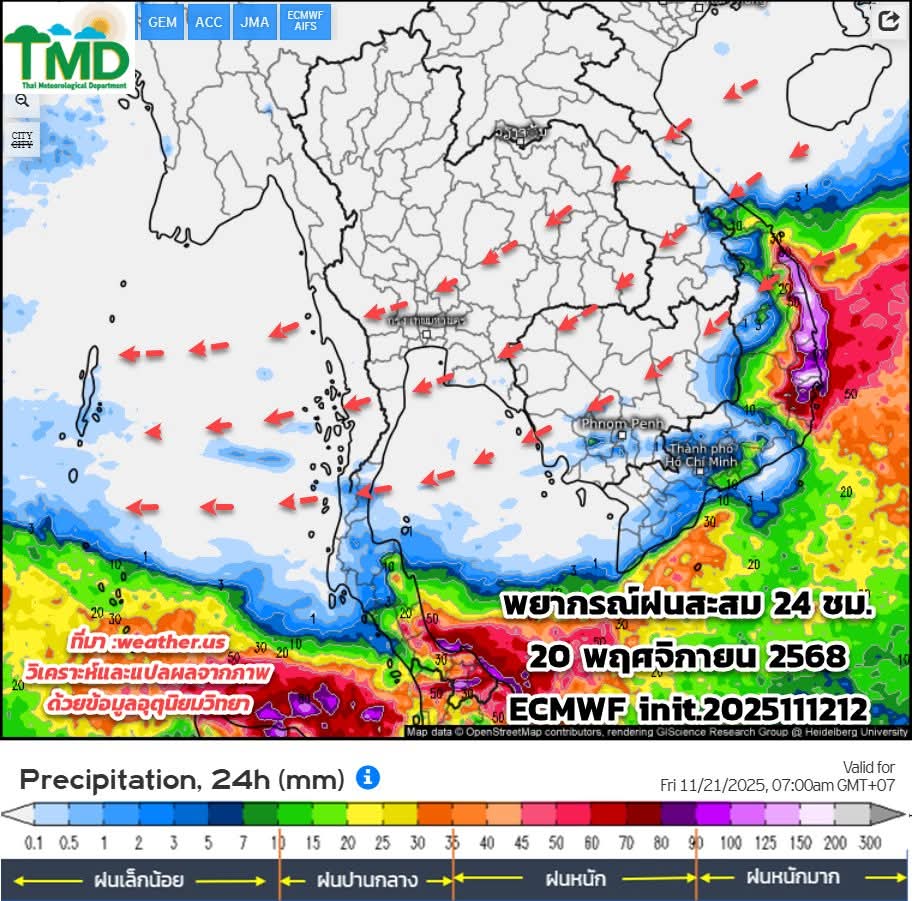 หลังจากวันที่18พ.ย.68 เตรียมรับลมหนาวและวางแผนท่องเที่ยวได้ในระยะนี้ในพื้นที่ภาคเหนือ ภาคอีสานตอนบน อุณหภูมิเริ่มลดลง อากาศเย็นถึงหนาว ยอดดอย ยอดภูหนาวถึงหนาวจัด เมื่อลมหนาวแรงขึ้น ประกอบกับอาจมีหย่อมความกดอากาศต่ำ เคลื่อนผ่านภาคใต้ จะทำให้ภาคใต้โดยเฉพาะฝั่งอ่าวไทย มีฝนเพิ่มขึ้น และมีฝนตกหนัก ถึงหนักมาก พี่น้องชาวใต้ต้องเฝ้าระวังและเตรียมความพร้อมรับมือฝนที่ตกหนัก ฝนตกสะสม อาจทำให้มีน้ำท่วมฉับพลัน น้ำป่าไหลหลากตั้งแต่วันที่ 16 พ.ย.68 เป็นต้นไป (ข้อมูลยังมีการเปลี่ยนแปลง ใช้เป็นแนวทางเพื่อประกอบการตัดสินใจการติดตามสภาพอากาศ)