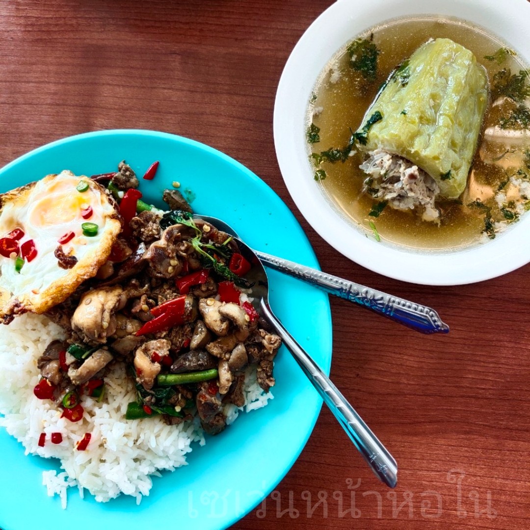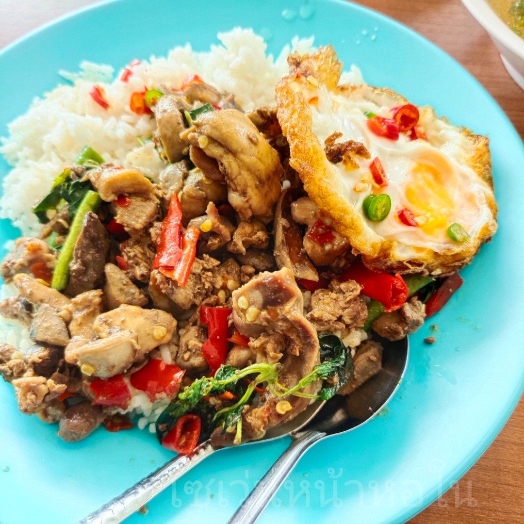 กะเพราเครื่องในไก่+ไข่ดาว 45 บาท