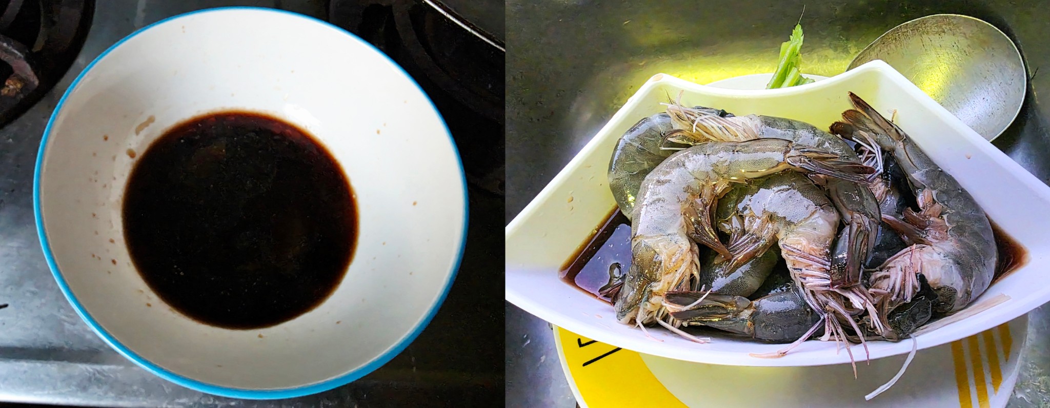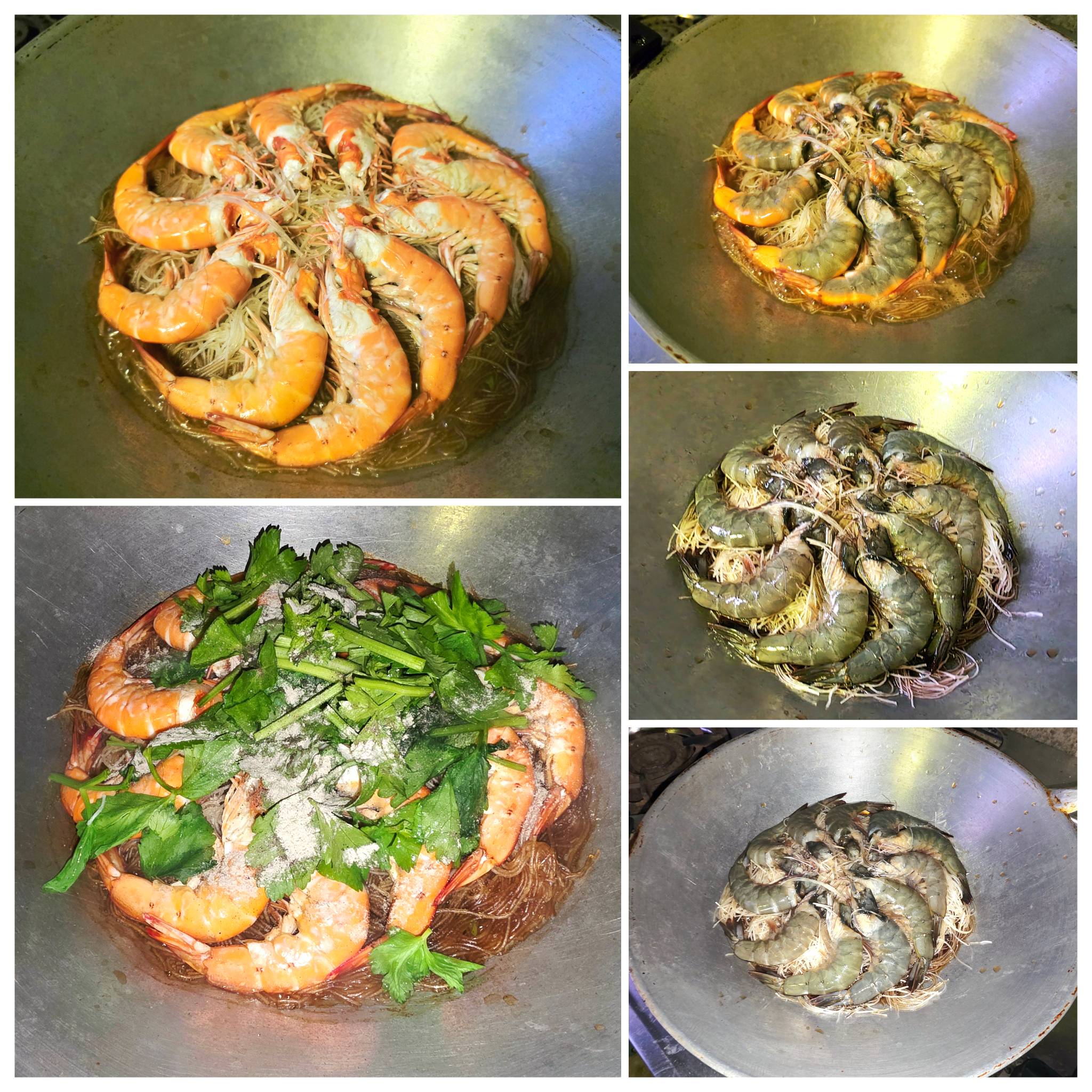 3. เอากุ้งที่เตรียมไว้ มาแช่ใน น้ำปรุง แล้วเอามาเรียงทับบนวุ้นเส้น เอาน้ำปรุงที่เหลือราดให้ชุมๆ ใช้ไปกลางๆ เอาฝาหม้อปิดให้อบไว้