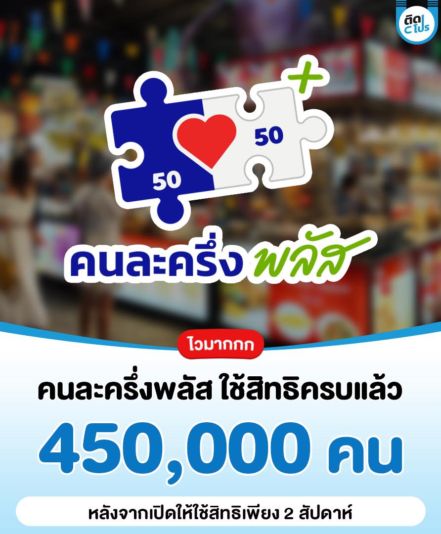 กระทรวงการคลัง เปิดเผยข้อมูลสถิติของ "โครงการคนละครึ่งพลัส" หลังจากเปิดให้ใช้มาแล้ว 2 สัปดาห์ โดยระบุว่ามีประชาชนได้ใช้สิทธิครบตามจำนวนที่กำหนดแล้วทั้งสิ้น 450,000 คน