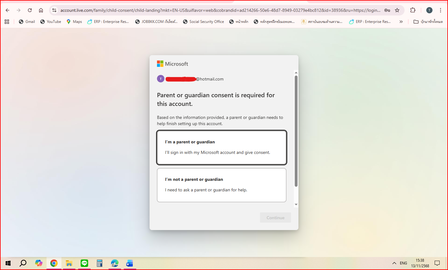 บัญชี hotmail อยู่ๆมีข้อความแจ้ง จำเป็นต้องได้รับความยินยอมจากพ่อแม่หรือผู้ปกครอง