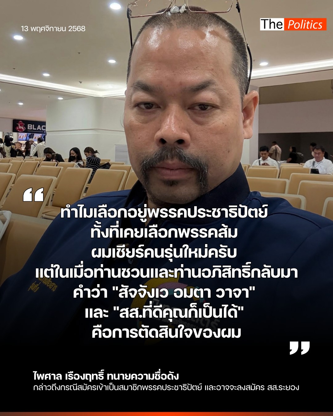 วันที่ 13 พ.ย. นายไพศาล เรืองฤทธิ์ หรือ ทนายไพศาล โพสต์ข้อความผ่านเฟซบุ๊กกรณีสมัครสมาชิกพรรคประชาธิปัตย์ และอาจจะลงสมัคร สส.ระยอง โดยระบุว่า "ทำไมเลือกอยู่พรรคประชาธิปัตย์ ทั้งที่เคยเลือกพรรคส้ม ผมเชียร์คนรุ่นใหม่ครับ แต่ในเมื่อท่านชวนและท่านอภิสิทธิ์กลับมา คำว่า "สัจจังเว อมตา วาจา" และ "สส.ที่ดีคุณก็เป็นได้" คือการตัดสินใจของผม"