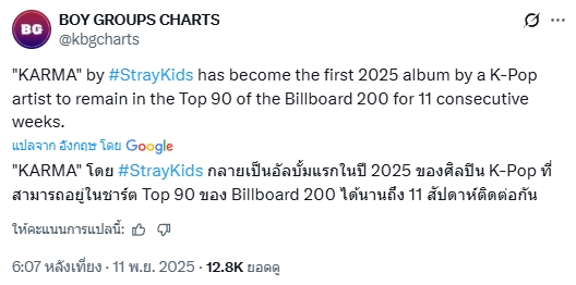 🔥 Stray Kids "KARMA" ครองอันดับ 86 บน Billboard 200 กลายเป็นอัลบั้มแรกของ K-Pop ในปี 2025 ที่อยู่ใน Top 90 ของชาร์ต Billboard 200 ติดต่อกันเป็นเวลา 11 สัปดาห์