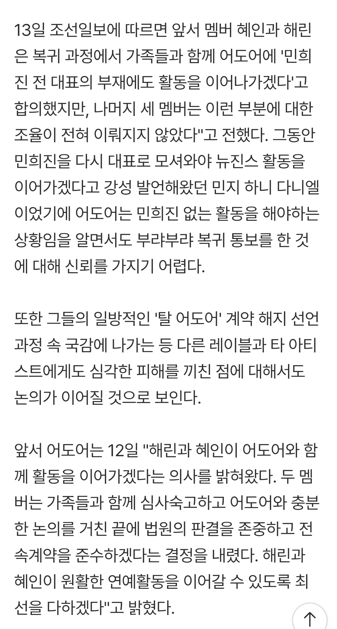 นอกจากนี้ ยังมีการคาดว่าจะมีการพูดคุยเพิ่มเติมเกี่ยวกับความเสียหายที่เกิดขึ้นจากการที่ทั้งสามคนเคย “ประกาศยกเลิกสัญญา” กับ ADOR ฝ่ายเดียว