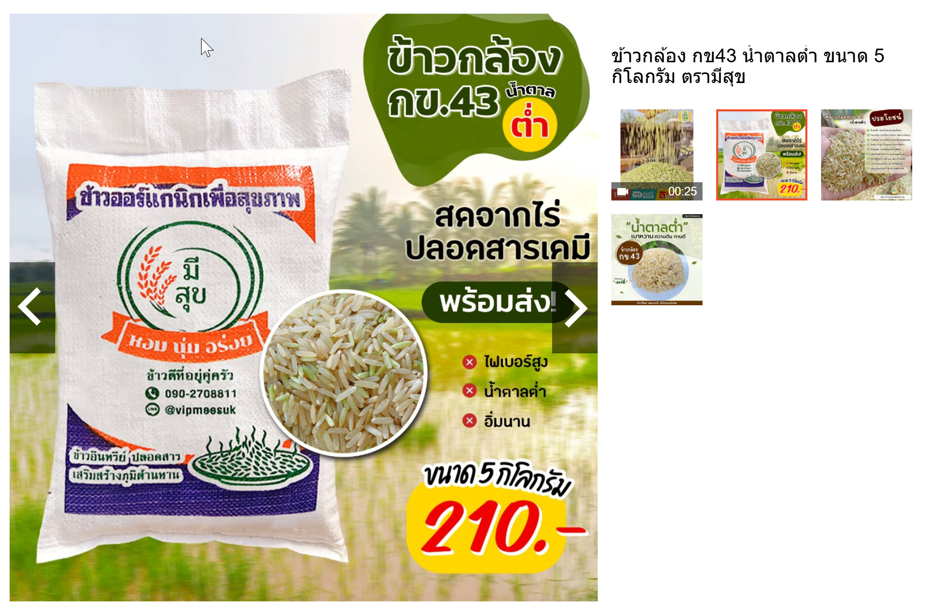 ตัวที่ 3 เป็นข้าว กล้อง กข.43 น้ำตาลต่ำ ราคา 210 บาท ต่อ 5 กก. หรือ กิโลละ 42 บาท แต่ตัวนี้แพ็คใส่กระสอบ 5 กก มาเลย