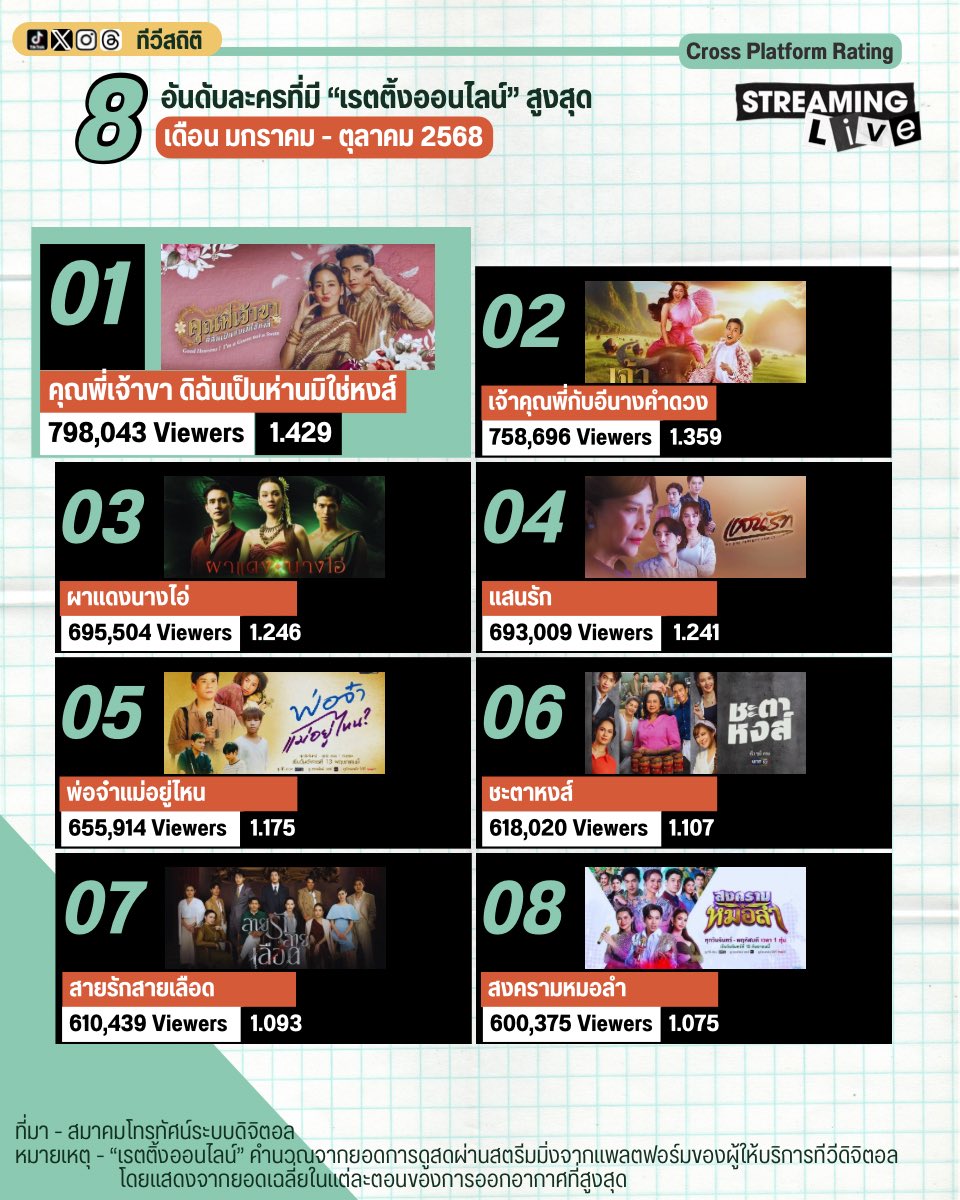 8 อันดับละครที่มีเรตติ้งออนไลน์สูงสุด มกราคม-ตุลาคม 68 : คุณพี่เจ้าขาดิฉันเป็นห่านมิใช่หงส์ เรตติ้งสูงสุด