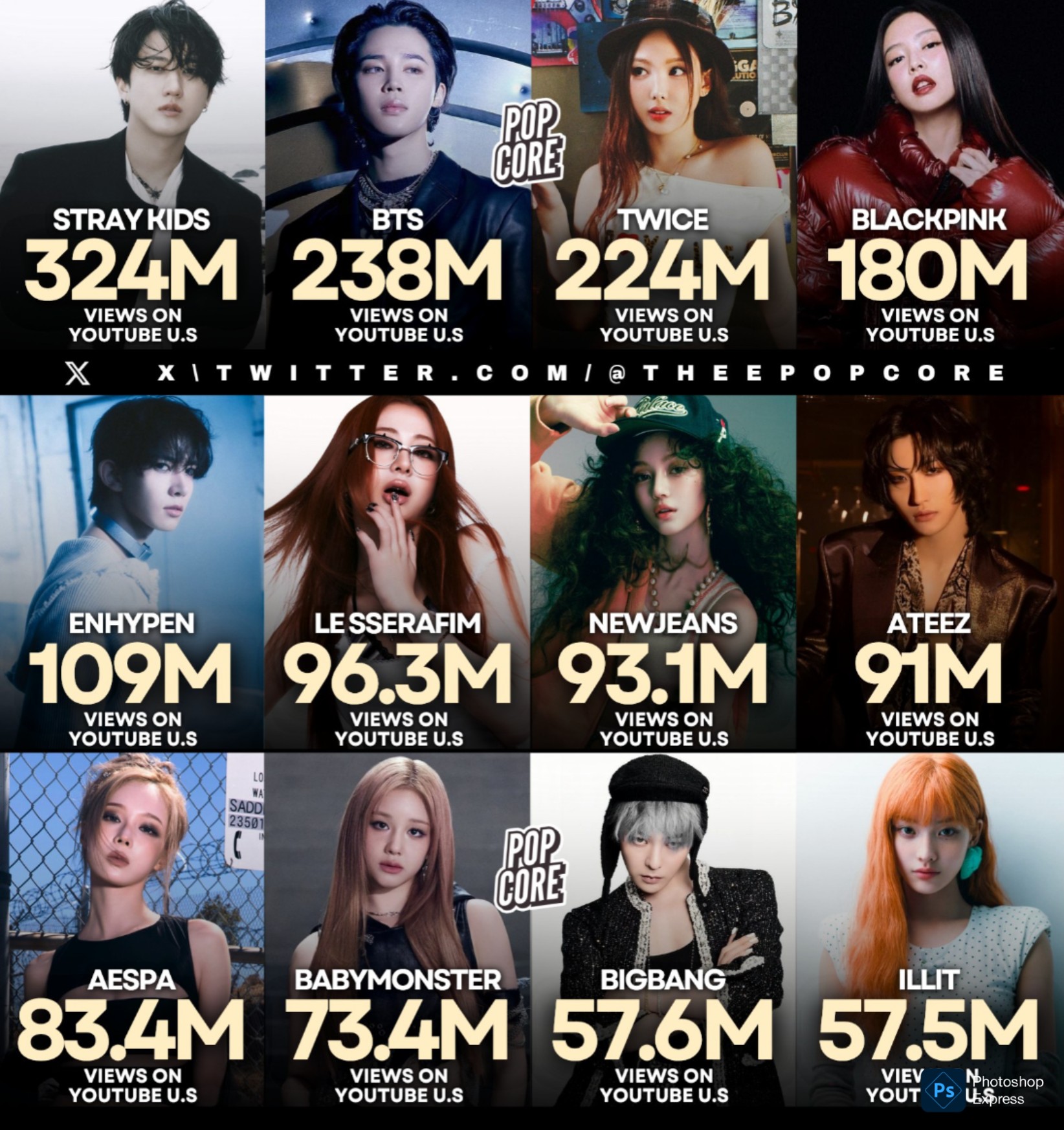 BABYMONSTER เป็นวงเคป๊อปเจน 5 เพียงวงเดียวที่มียอดวิวสูงสุดอยู่ในอันดับ Top 10 บน YouTube US แม้จำนวนเพลงจะน้อยกว่าวงรุ่นพี่หลายวง
