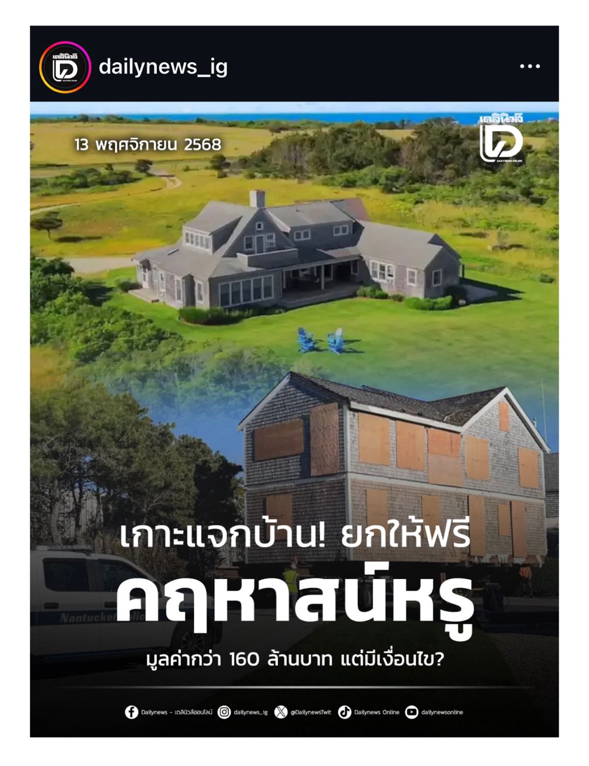 เมื่อวันที่ 12 พ.ย. เว็บไซต์ต่างประเทศ "NEW YORK POST" รายงานเรื่องราวที่น่าประหลาดใจในแนสทักเก็ต (Nantucket) รัฐแมสซาชูเซตส์ สหรัฐอเมริกา มีบ้านพักตากอากาศหรู 5 ห้องนอน มูลค่าสูงถึง 5 ล้านดอลลาร์สหรัฐฯ หรือประมาณ 161 ล้านบาท ถูกประกาศยกให้