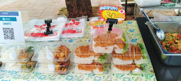 อรุณสวัสดิ์ค่ะ วันนี้วันหยุด ไปตลาดเช้าแวะซื้อ กะเพราลูกชิ้นหน่อไม้ (กับข้าว) ถุงละ 30 บาท มาทานกับ ข้าวผัดไข่ ที่บ้าน ปิดด้วย คัพเค้กกล้วยหอม 12 บาท อิ่มมื้อเช้าไปอีกมื้อ ~