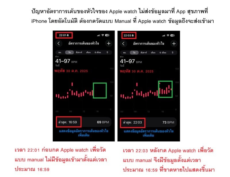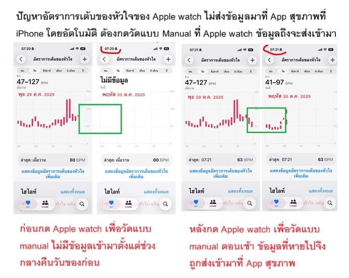 ตามตัวอย่าง เป็นการอธิบายว่าตอนเช้าวันที่ 30.10.2025 เวลา 7:20 น. เราพบว่าไม่มีข้อมูลอัตราการเต้นของหัวใจแสดงที่ App สุขภาพ ตั้งแต่คืนวันที่ 29.10.2025 ตามภาพด้านซ้าย และเมื่อผมกดวัดอัตราการเต้นของหัวใจแบบ manual ที่ตัว Apple watch หลังจากนั้นข้อมูลที่ค้างอยู่ก็จะถูกรวบส่งและแสดงขึ้นมา
