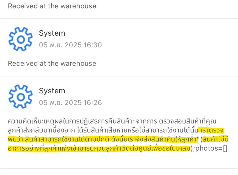 สินค้าที่ผมส่งไปถูกปฏิเสธการรับคืน ด้วยความเห็นด้านล่างนี้