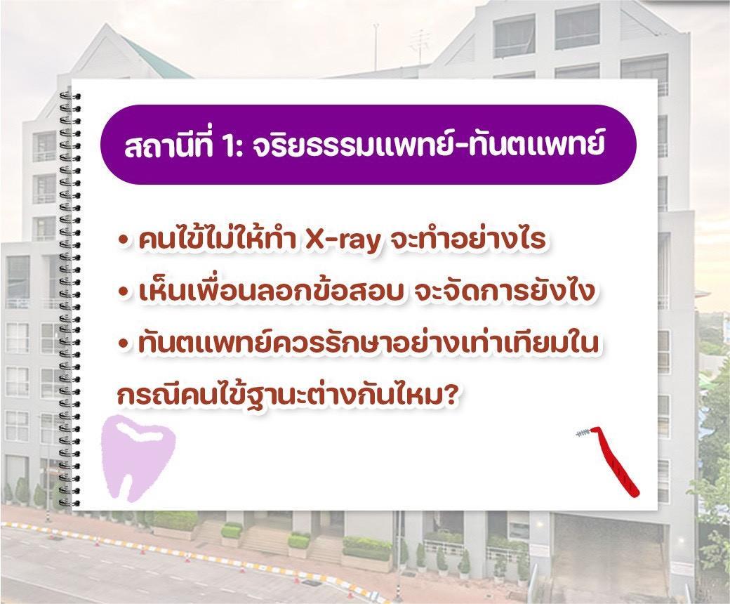 จริยธรรมแพทย์-ทันตแพทย์: สถานการณ์ที่ต้องวัดความเป็นคนละเอียด (เช่น เห็นเพื่อนโกงข้อสอบ, การรักษาคนไข้ฐานะต่างกัน)