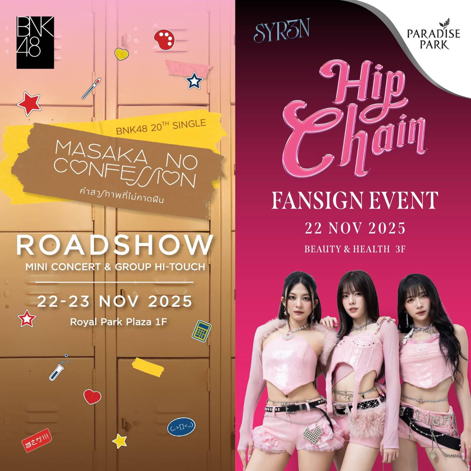 🎤 BNK48 กลับมาอีกครั้ง! กับ PARADISE PARK "BNK48 ROADSHOW & FAN SIGN" ในเดือนพฤศจิกายนนี้ กับซิงเกิ้ลใหม่! BNK48 20th SINGLE (Masaka no Confession – คำสารภาพที่ไม่คาดฝัน) และ Hip Chain / SYR3N