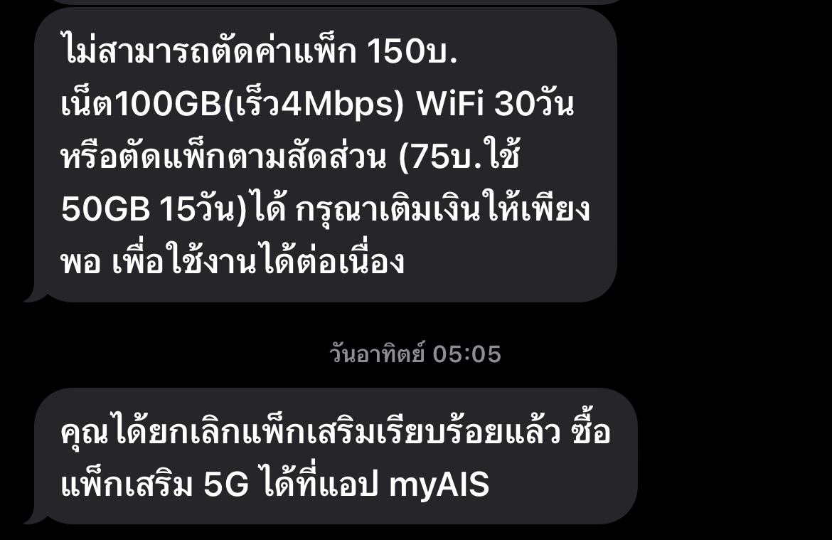 เผลอกดยกเลิกแพคเกจเน็ต แพ็ก150บ. เน็ต100GB(เร็ว4Mbps) โทรฟรี WiFi 6เดือน จะเริ่มคิดค่าแพ็กรอบใหม่ 27/02/2025กรุณาเติมเงินให้เพียงพอ(กรณีเงินไม่พอ จะตัดค่าแพ็กโดยใช้ได้ตามสัดส่วนคือ 75บ.ใช้ได้ 50GB 15ว