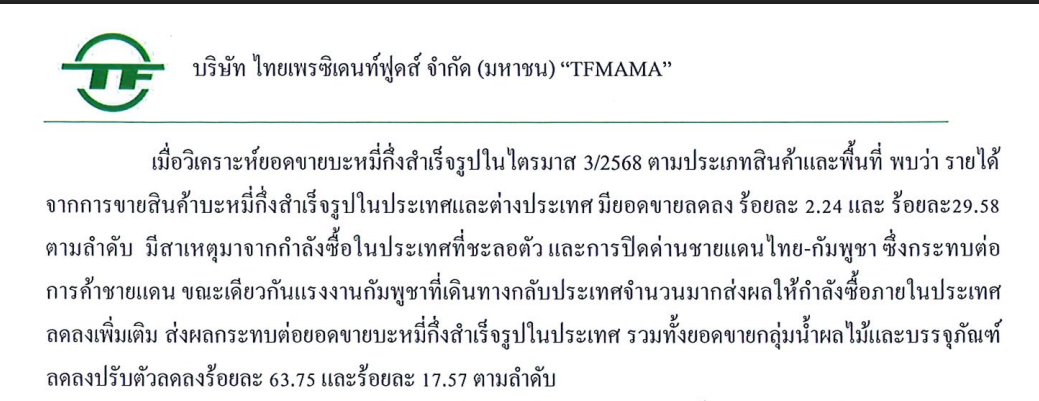 บริษัท ไทยเพรซิเดนท์ฟูดส์ จำกัด (มหาชน)และบริษัทย่อย ไตรมาส 3/68 มีกำไรสุทธิ 853.65 ล้านบาท กำไรสุทธิต่อหุ้น 2.59 บาท