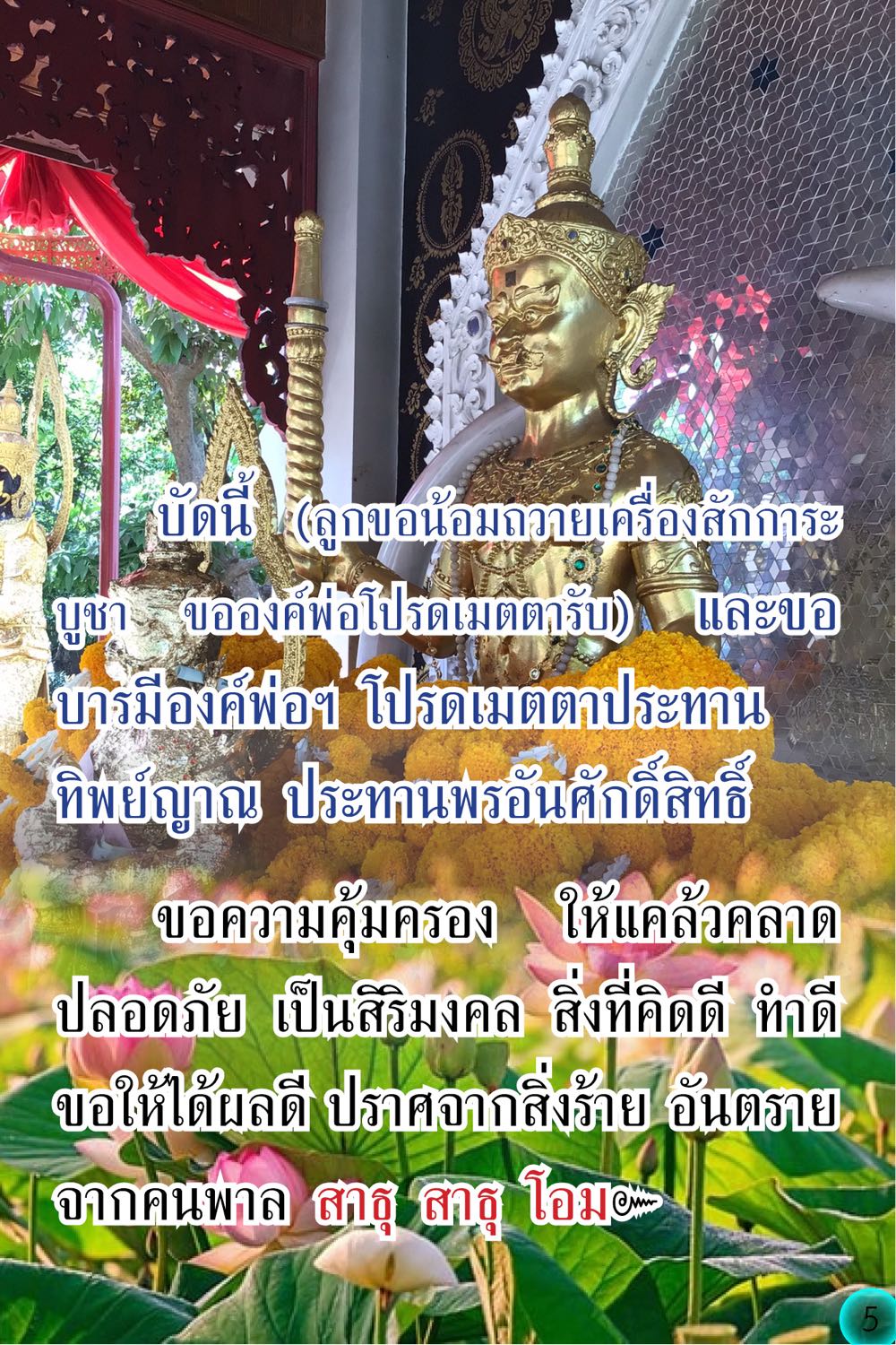 บัดนี้ ลูกขอน้อมถวายเครื่องสักการะบูชา (ชื่อของถวาย...) ขอองค์พ่อโปรดเมตตารับ และขอบารมีองค์พ่อฯ โปรดเมตตาประทานทิพย์ญาณ โปรดประทานพรอันศักดิ์สิทธิ์ ขอความคุ้มครอง ให้แคล้วคลาดปลอดภัย เป็นสิริมงคล สิ่งที่คิดดี ทำดี ขอให้ได้ผลดี ปราศจากสิ่งร้าย อันตรายจากคนพาล สาธุ สาธุ โอม๛