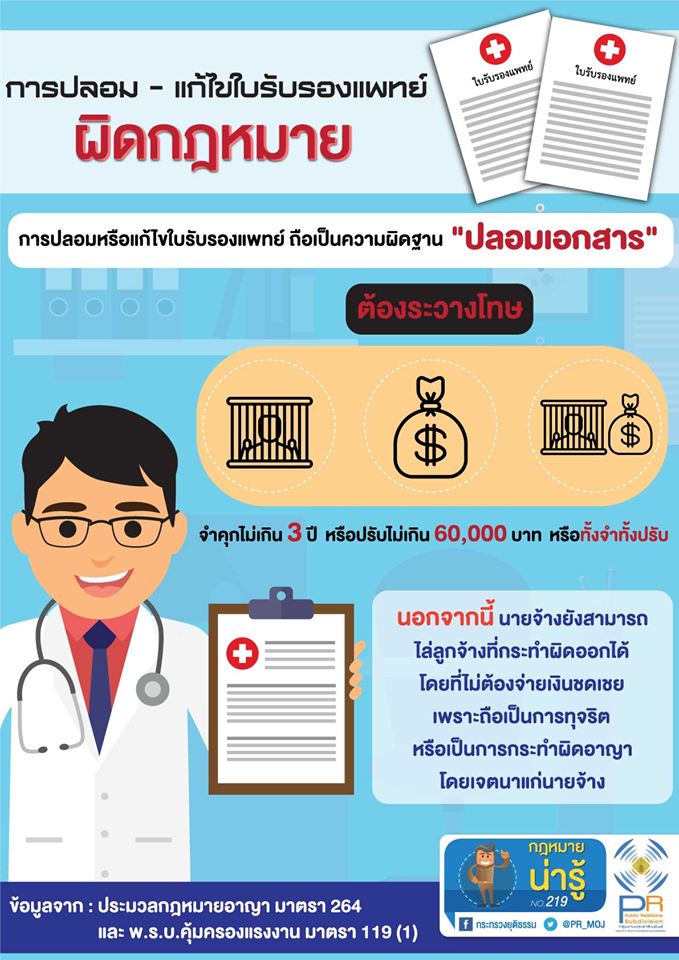 ใบรับรองแพทย์ เป็นเท็จ ปลอมแปลง มีบทลงโทษทางกฏหมาย .. ใช้ผิด ติดคุกได้ (ทั้งแพทย์ผู้เขียนและผู้นำใบรับรองแพทย์ไปใช้)