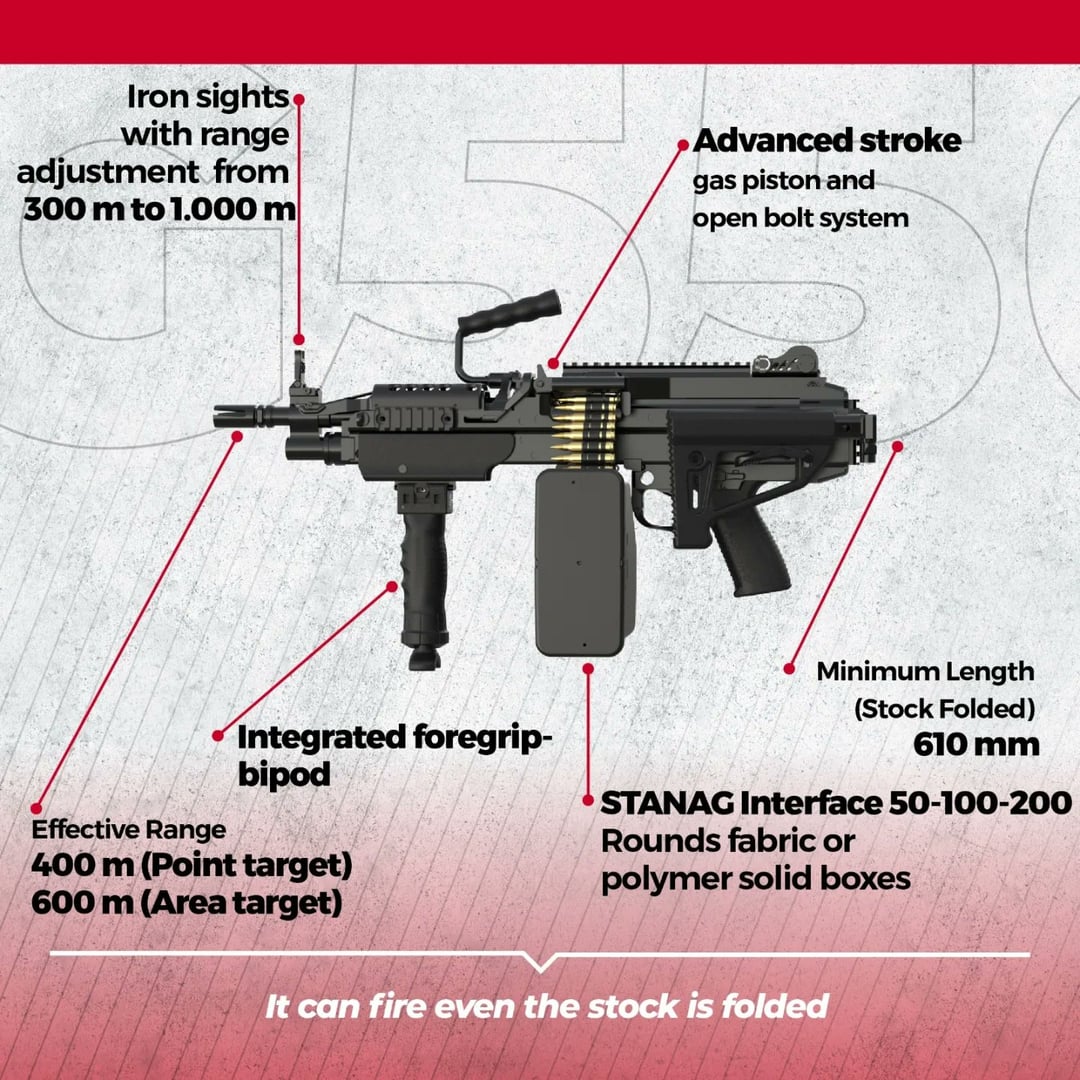 KMG556CL ปืนกลเบาสมัยใหม่ของตุรกีขนาด 5.56 มม. x 45 NATO ที่มีความกะทัดรัดและน้ำหนักเบาเป็นพิเศษออกแบบมาสำหรับภารกิจที่น้ำหนักและขนาดมีความสำคัญอย่างยิ่งเหมาะแก่การเลือกใช้ในสถานการณ์ที่ต้องการการสนับสนุนการยิงในระดับสูงภายใต้รูปทรงที่เบาและกะทัดรัดสามารถยิงจากบ่าได้อย่างสะดวกสบายคล้ายปืนไรเฟิลจู่โจมเนื่องจากมีน้ำหนักเบาและแรงสะท้อนกลับปานกลาง