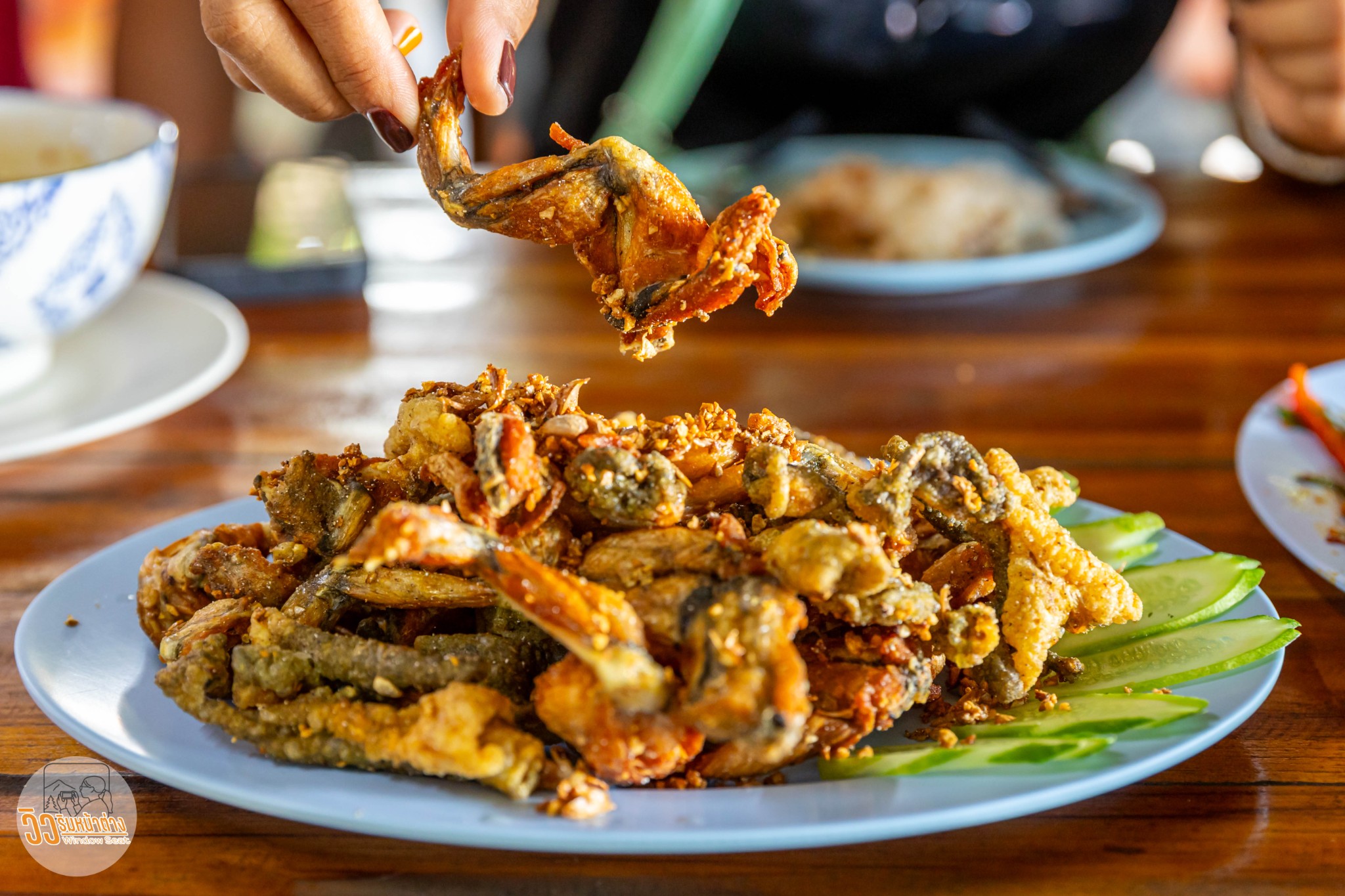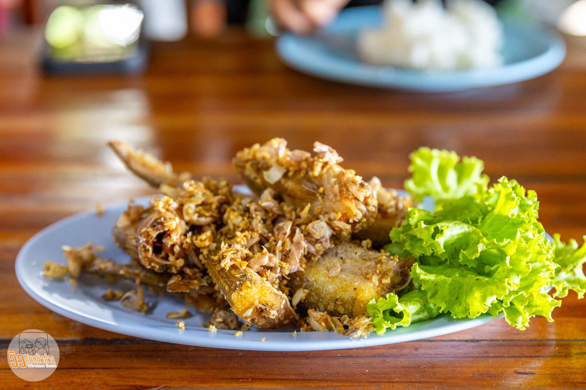 ราคาอาหารเฉลี่ยประมาณร้อยบาทกลางๆ รอไม่นานนักอาหารก็มาเสริฟ ปริมาณอาหารที่ให้มาค่อนข้างเยอะอยู่ครับ หน้าตาดูดีใช้ได้ เอาจานที่ถูกปากผมที่สุดก่อนแล้วกันครับ “กบทอดกระเทียม” ขากบทอดมากับหนังกบทอดพร้อมกระเทียม น่องกบที่มาน่าจะเป็นน่องกบนักกระโดดไกล กล้ามเนื้อเป็นมัดๆ หลายคนบอกว่าเนื้อกบเหมือนเนื้อไก่ ผมก็ว่าอย่างนั้นเป็นเนื้อที่ไม่มีรสชาติแต่มีความเป็นกล้ามเนื้อ แต่เนื้อกบออกจะเบาๆหน่อย กลิ่นกระเทียมหอมฉุย ทานเพลินมาก