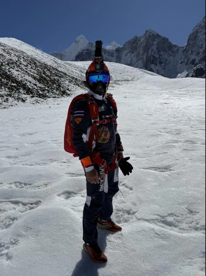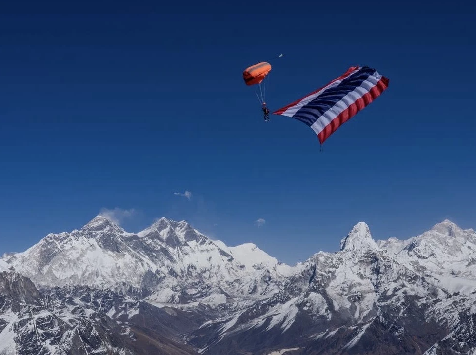 14 พฤศจิกายน 2568 เวลา 09.48 น.ตามเวลาท้องถิ่นประเทศเนปาล ณ บริเวณ Base Camp รองศาสตราจารย์ ดร.ธนบวร สิริคุณากรกุล เจ้าของฉายา “ซูเปอร์ตุ้ม” นักกระโดดร่มชาวไทย ที่เคยเป็นข่าวตามสื่อโชเชียลต่างๆ มากมาย ด้วยการนำธงไตรรงค์ไปกางอยู่เหนือน่านฟ้าสแกนดิเนเวีย ประเทศเดนมาร์ก ซึ่งครั้งนั้นเป็นการฝึกซ้อมสำหรับภารกิจอันยิ่งใหญ่ของชาวไทย นั่นคือการกระโดดร่มและโรยธงชาติขนาด 150 ตารางเมตร เหนือยอดเขาเอเวอเรสต์