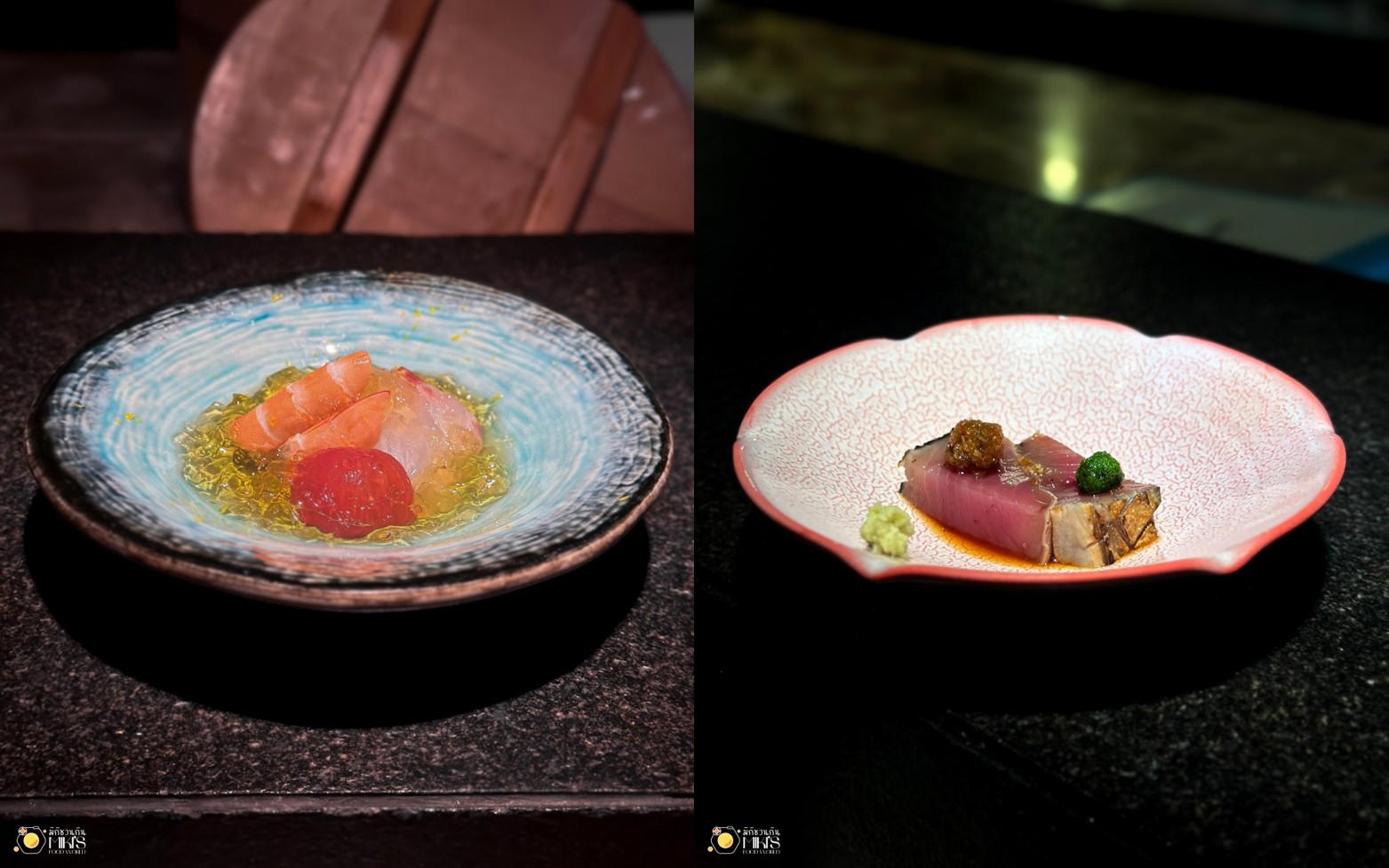 Sunomono เริ่มต้นเบาๆ ด้วยรสเปรี้ยวสดชื่น ที่มีทั้งปลามาไดเนื้อนุ่ม อาโอริอิกะหนุบลื่น และกุ้งเทนชิโนะที่กรอบเด้งหวานธรรมชาติ เสิร์ฟพร้อมซอสเปรี้ยวในรูปแบบเจลลี่จากเจลาตินปลา เป็นจานเปิดที่เรียกน้ำย่อยได้ดีมาก