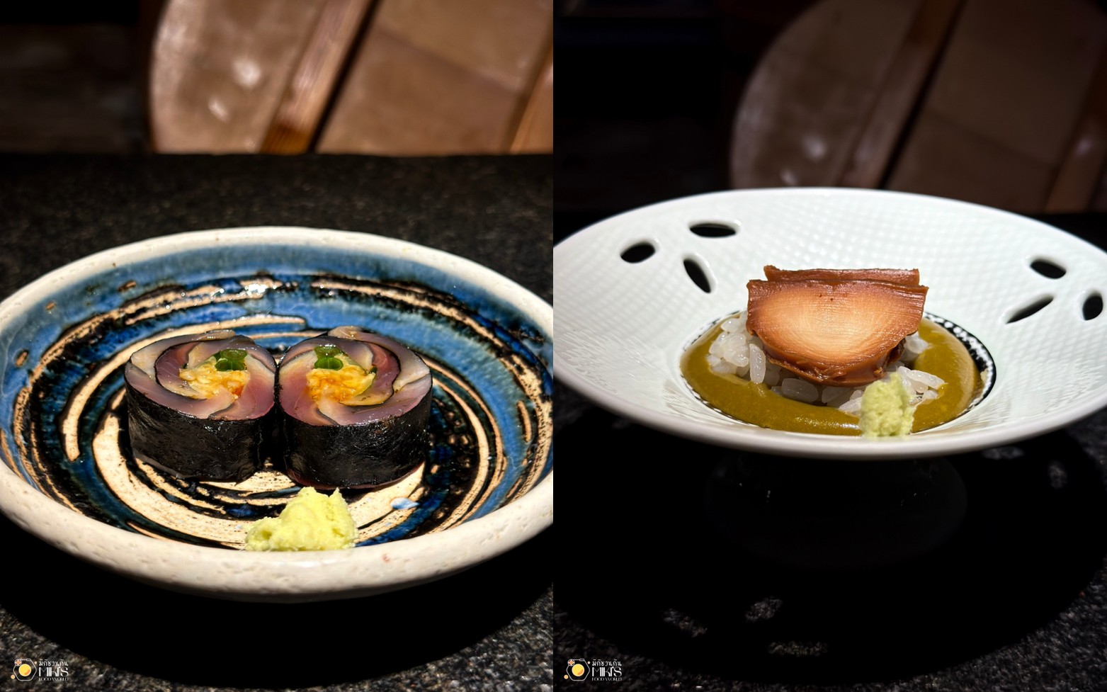 Isobe Maki มากิที่ใช้ปลามาห่อแทนข้าว เป็นปลามะซาบะเกรดสูงสุดที่ทานดิบได้ มีชั้นไขมันและคอลลาเจนละมุน เคล้ารสเปรี้ยวหวานสดชื่นจากการดองน้ำส้ม เป็นคำที่มีทั้งเท็กซ์เจอร์และรสกลมกล่อมจนหยุดคิดถึงไม่ได้