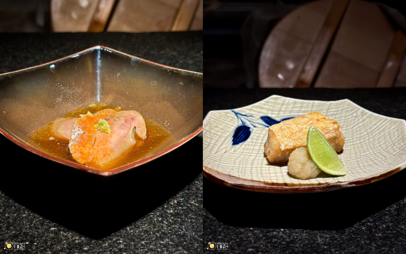 Yakimono ส่วนคางของปลาอามาจิ ย่างและเบิร์นจนหนังกรอบแต่เนื้อในยังฉ่ำ บีบมะนาวนิด ทานพร้อมหัวไชเท้าขูด ได้ทั้งความนุ่ม กรอบ และสดชื่น