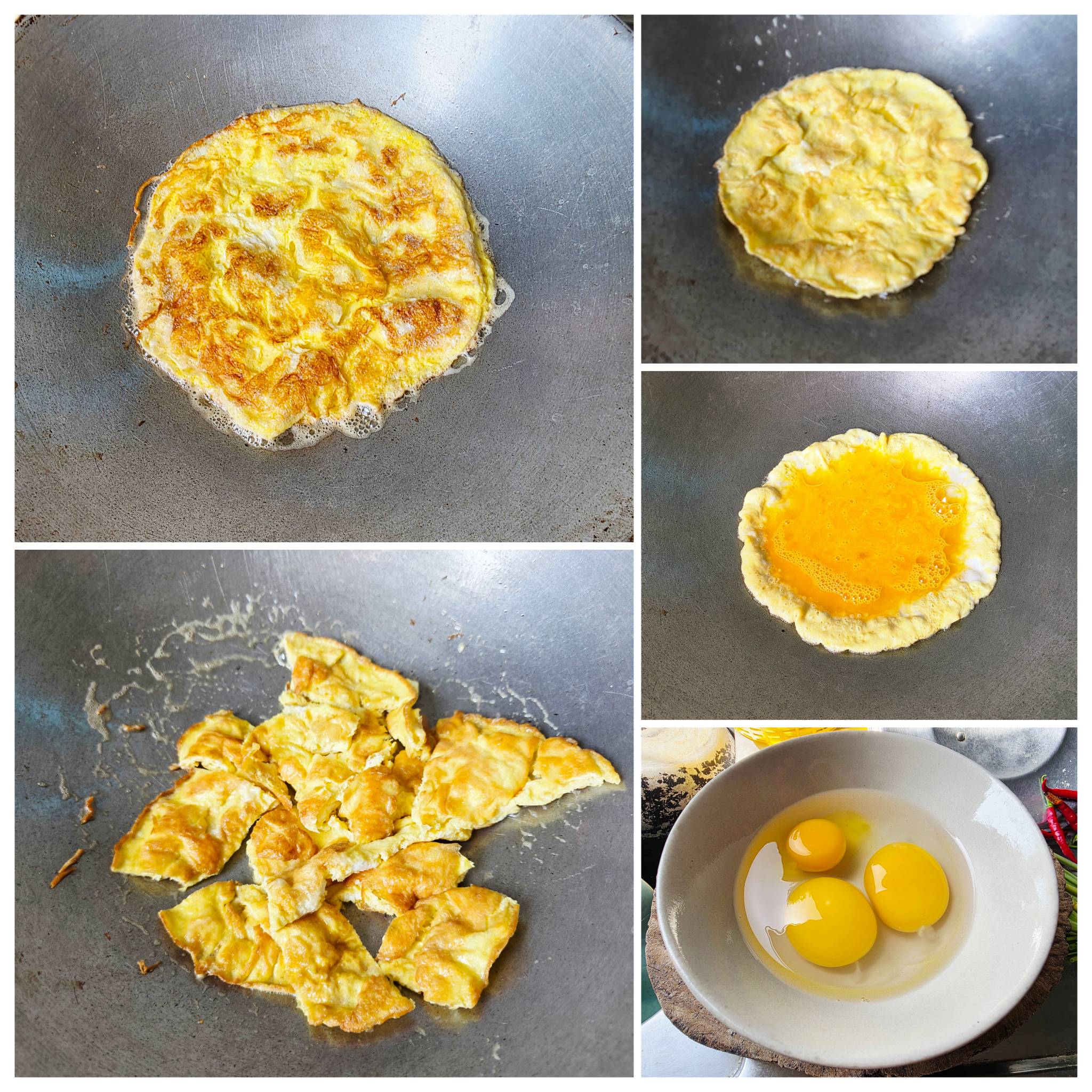 1. เจียวไข่ ใช้ไข่ตามชอบ ผมใช้ไข่เป็ด 2 ฟองกับ ไข่ไก่แจ้ 1 ฟอง ตีให้เข้ากัน ทอดให้หอมๆ เหลืองๆ แล้วยีๆ ให้แตกเป็นชิ้น พักไว้