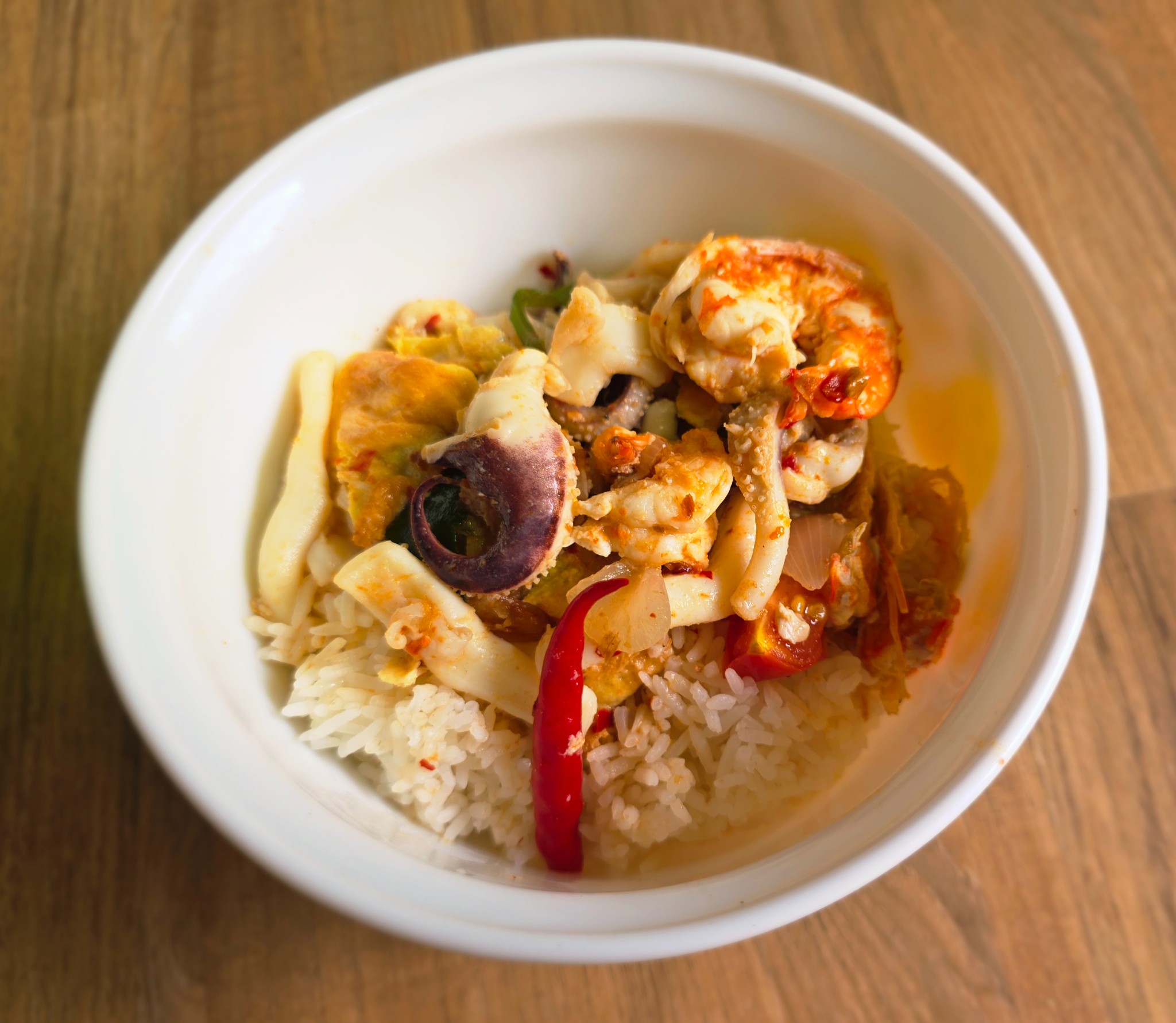 มื้อนี้ ผมมีกุ้งแม่น้ำกับ หนวดปลาหมึก กับปลาหมึกตัว โดยเอา กุ้งมาปลอกเปลือกเอาก้อนอึ ของเสียที่หัวกุ้งออก ผ่าหลังเอาเไส้กุ้งออก