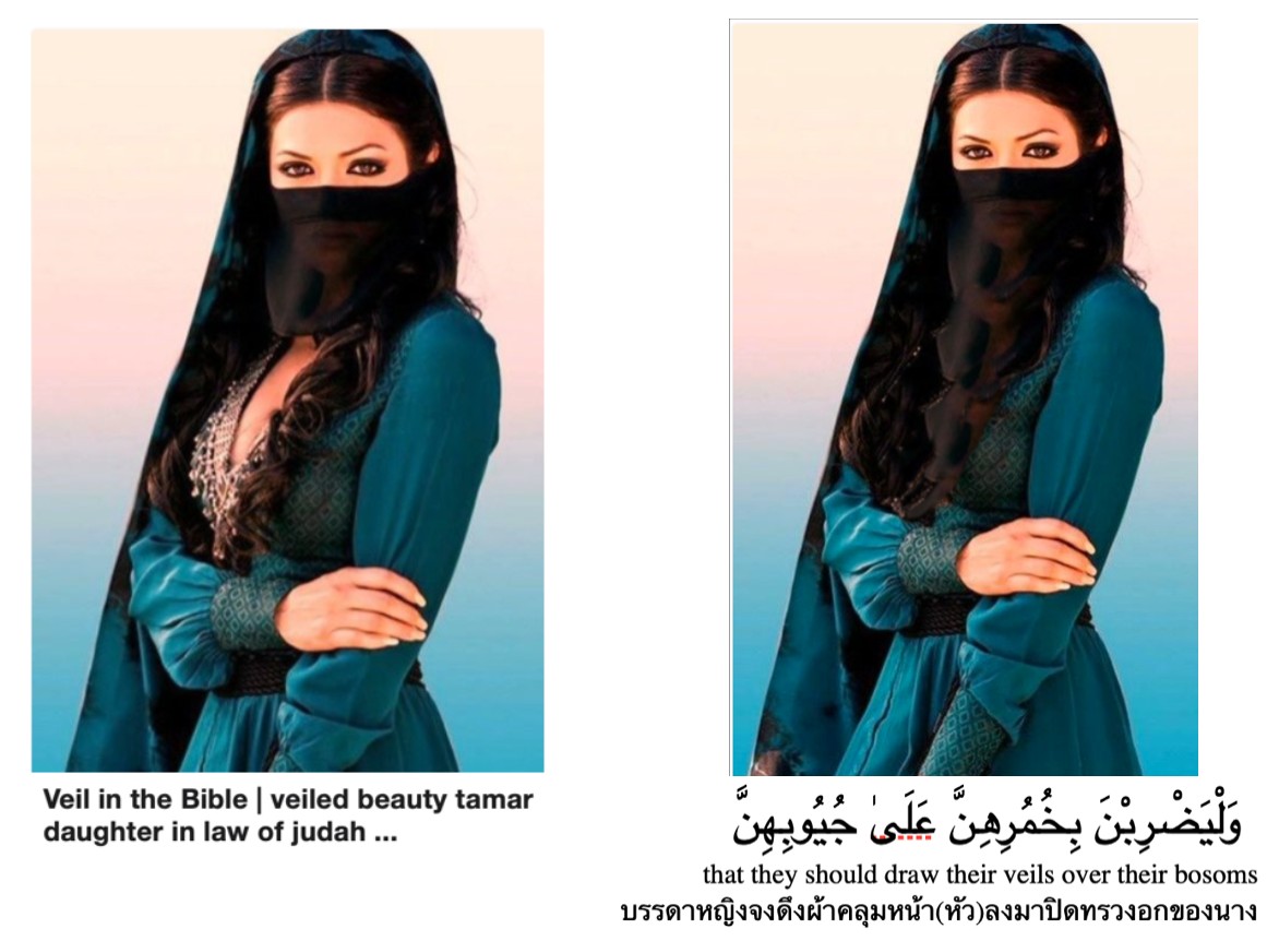 จากภาพจะเห็นได้ว่า ภาพทางซ้ายมือเป็นการเปิดทรวงอกของสตรีก่อนที่จะมีศาสนาอิสลาม หลังจากที่ได้รับบัญญัติที่ 24:31 ซึ่งในบัญญัตินี้มีคำสั่ง ให้ "บรรดาหญิงจงดึงผ้าคลุมหน้า(หัว)ลงมาปิดทรวงอกของนาง"