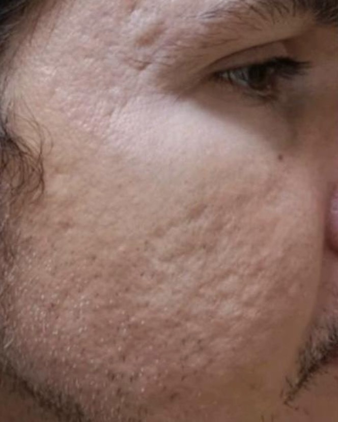 ก่อนทํา – หลุมค่อนข้างชัดมาก ในภาพก่อนทําจะเห็นชัดเลยครับว่าหลุมลึก และมีหลายจุดที่เป็นผังผืดใต้ผิวแบบฝังแน่น ก่อนหน้านี้เคยทํา Derma Roller มาบ้าง แต่ไม่เห็นผลอะไรชัดเจน ก็เลยไม่ได้คาดหวังอะไรมากกับการเริ่ม ต้นรอบนี้ แค่ขอให้ดีขึ้นบ้างก็ยังดี