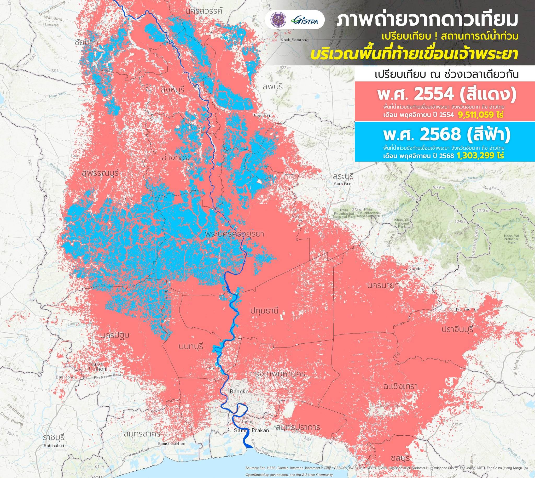 GISTDA เผยภาพจากดาวเทียมเปรียบเทียบ! พื้นที่น้ำท่วมขังปี 68 น้อยกว่ามหาอุทกภัยปี 54 กว่า 86%