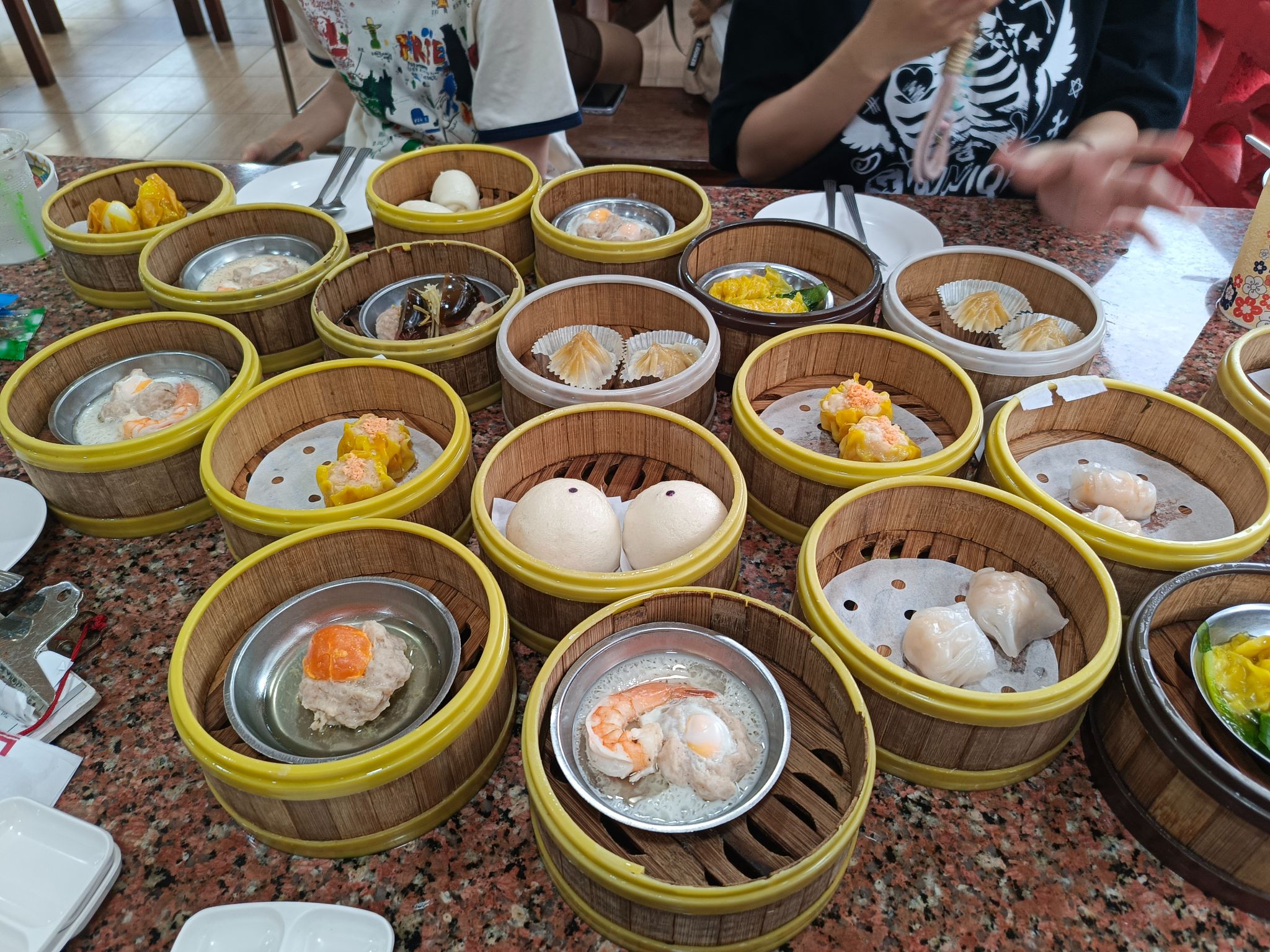 เมื่อเช็คอินเรียบร้อยแล้วกองทัพก็ต้องเดินด้วยท้อง พวกเราจึงหามื้อเช้าทานเป็นอันดับแรกโดยร้านที่เราเลือกไปคือ ร้านติ่มซำหอเจี๊ยะ เป็นเรื่องดีที่ร้านอยู่ใกล้กับโรงแรมมาก สามารถเดินไปได้แบบไม่เหนื่อยเลยค่ะ อาหารภายในร้านเต็มไปด้วยติ่มซำ ข้าวต้ม เครื่องดื่มมากมายทั้งร้อนและเย็น ซึ่งเป็นร้านอาหารเช้าที่โดดเด่นในเมืองและมีคนเข้ามาทานอยู่เรื่อยๆ เป็นร้านที่สมคำร่ำลือจริงๆ ค่ะ เพราะอร่อยมากๆ ติ่มซำราคาจะตกอยู่ที่จานละ 22-30 กว่าบาทค่ะ ทางร้านจะมีชาเก๊กฮวยเสิร์ฟให้ฟรีแบบร้อนๆ เลยค่ะ(ระวังลวกลิ้นนะคะ) อีกทั้งยังมีพวกเมนูข้าวต้ม เมนูน้ำหวาน ชา กาแฟให้เราได้สั่งด้วยนะคะ