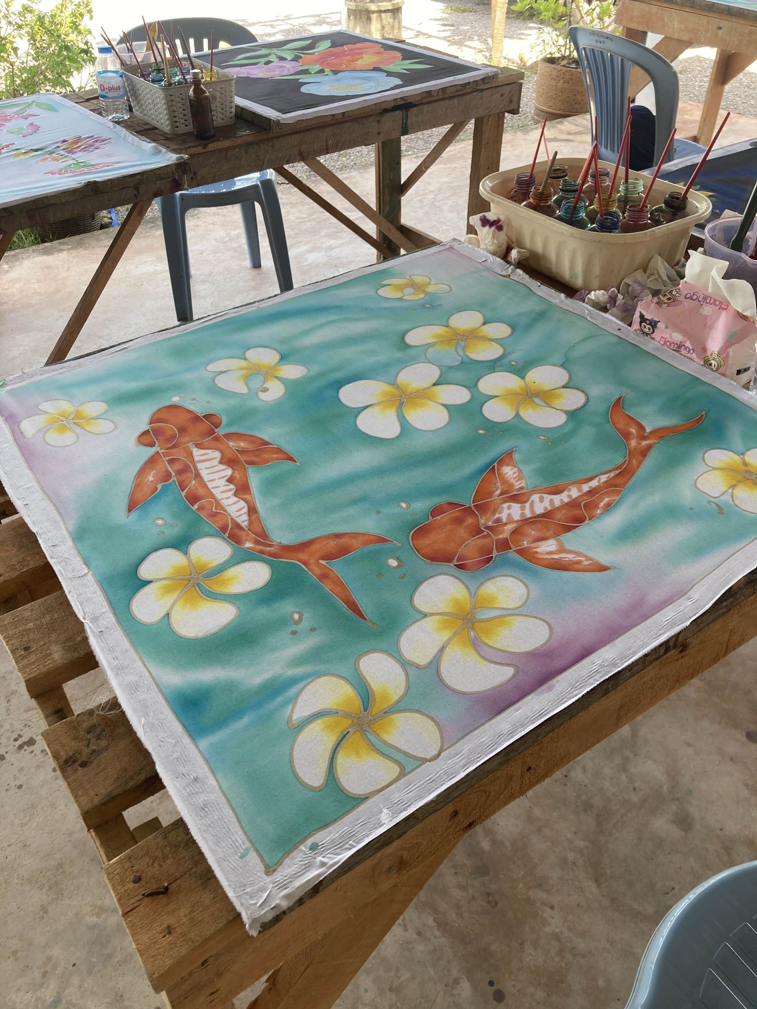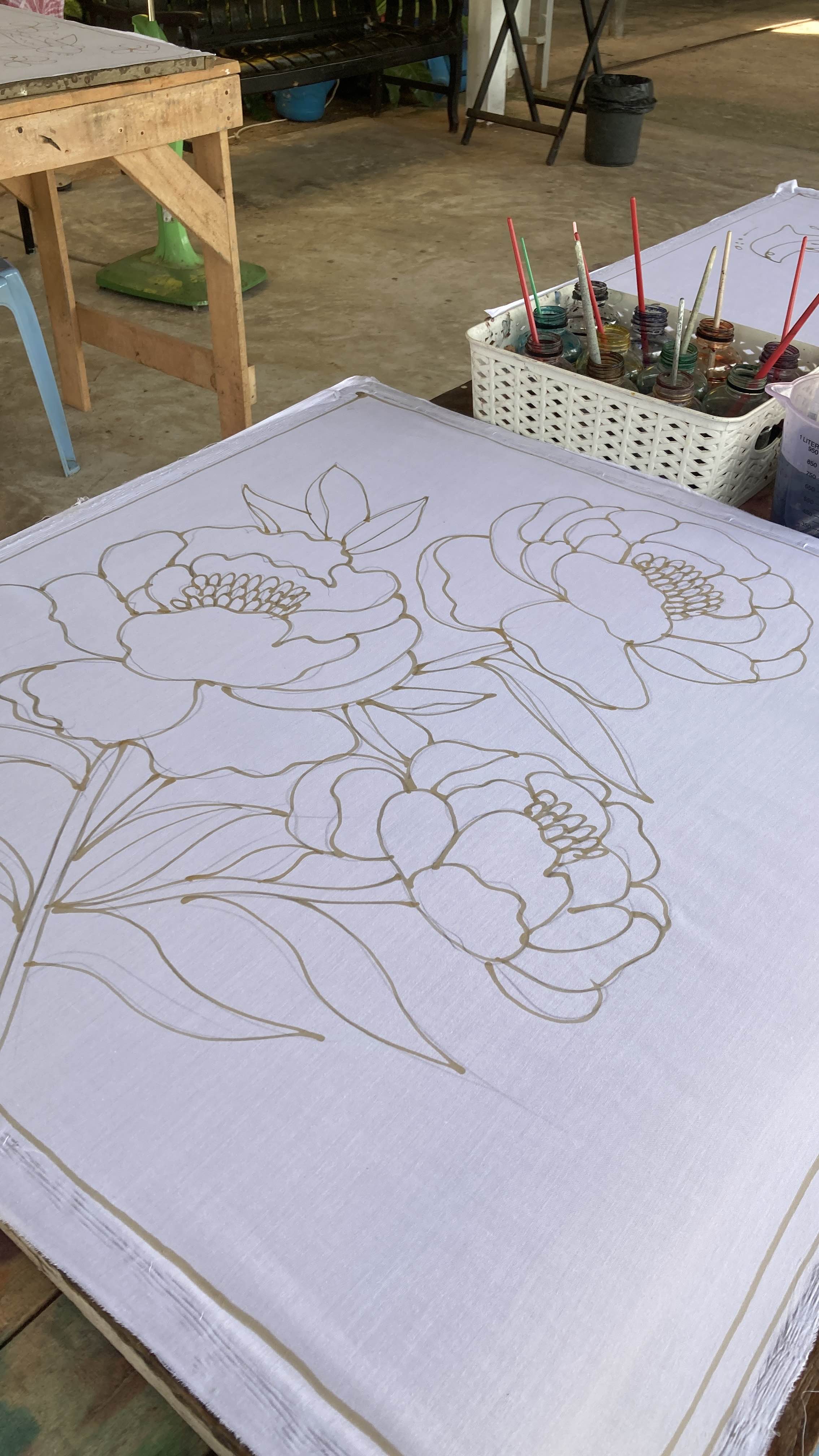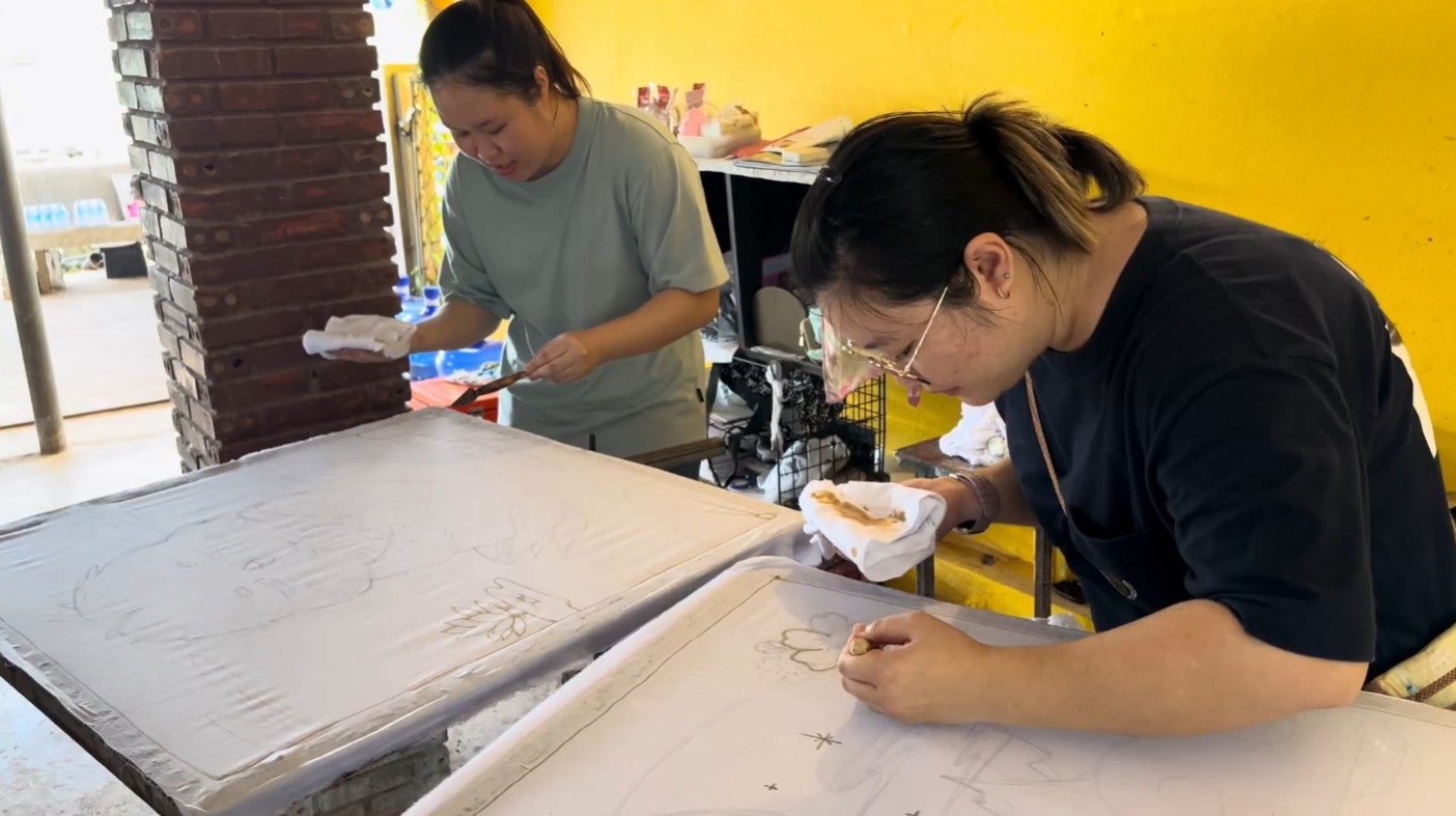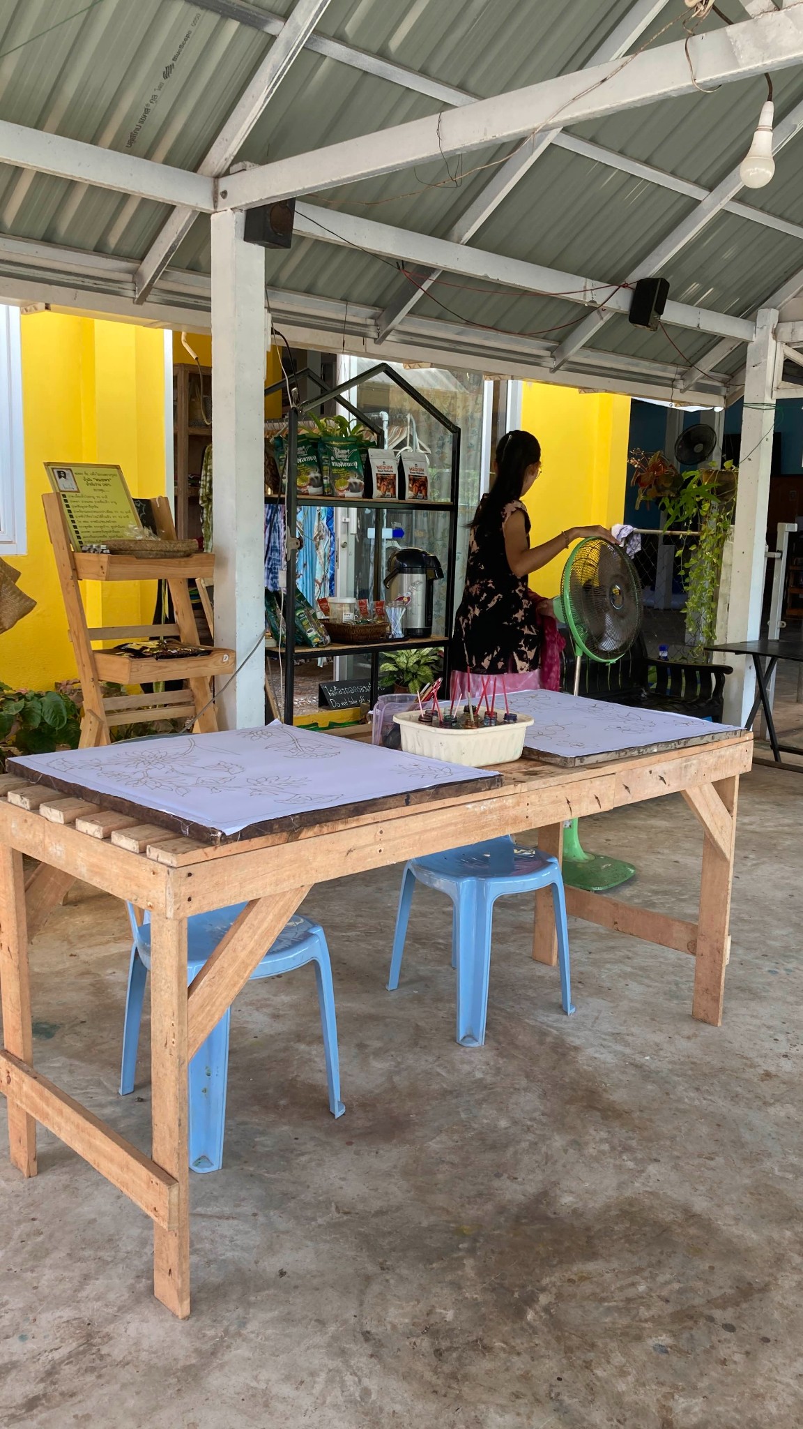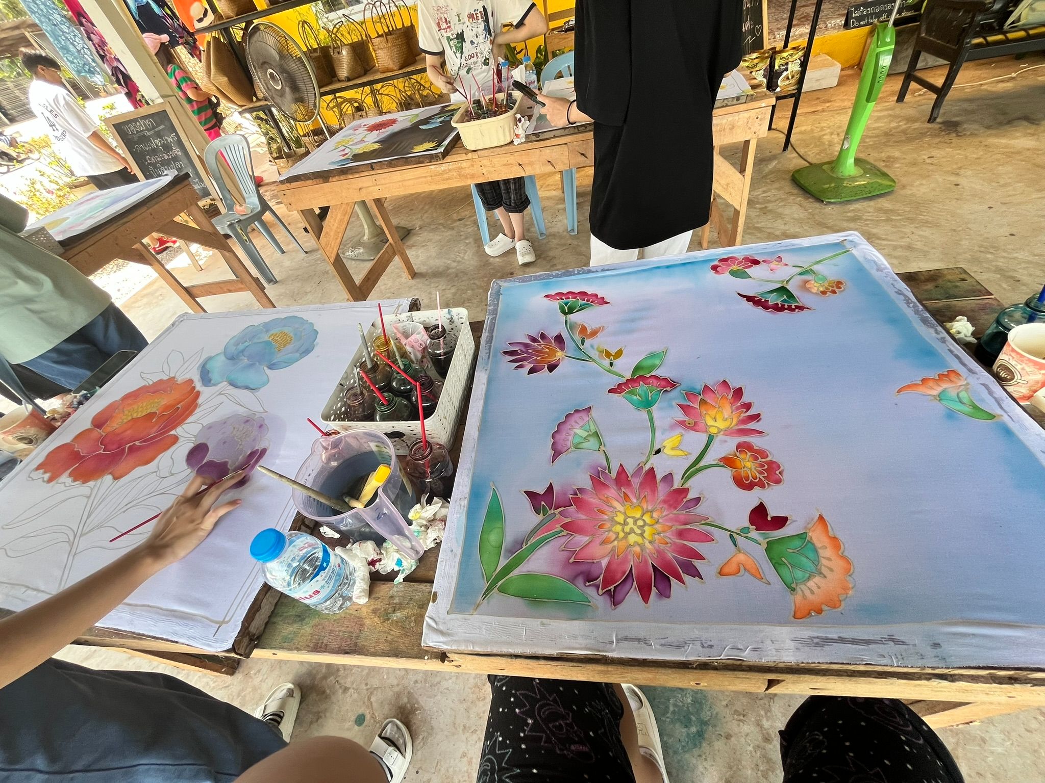 และในกิจกรรม Workshop จะได้พี่เจ้าของร้านจะลงมาสอนเอง และจะมีคุณป้าคุณยายผู้เชี่ยวชาญจะช่วยสอนวิธีการลงเทียนค่ะ ซึ่งทางร้านจะสอบถามความต้องการของเราไว้ก่อนวันที่จะเข้าไปทำกิจกรรม เราสามารถเลือกได้ว่าอยากให้ร้านเตรียมลวดลายผ้าบาติกไว้ให้เลยหรือไม่ และการลงสีเป็นหน้าที่ของพวกเรา หรือทางเลือกอีกแบบหนึ่งคือ เราสามารถวาดรูปหรือออกแบบลวดลายได้ตามใจเรา ซึ่งถ้าเลือกวาดเอง เราก็จะได้ลองเขียนเทียนเองเพื่อกันสีน้ำไม่ให้เลอะออกจากพื้นที่ที่ไม่ต้องการค่ะ