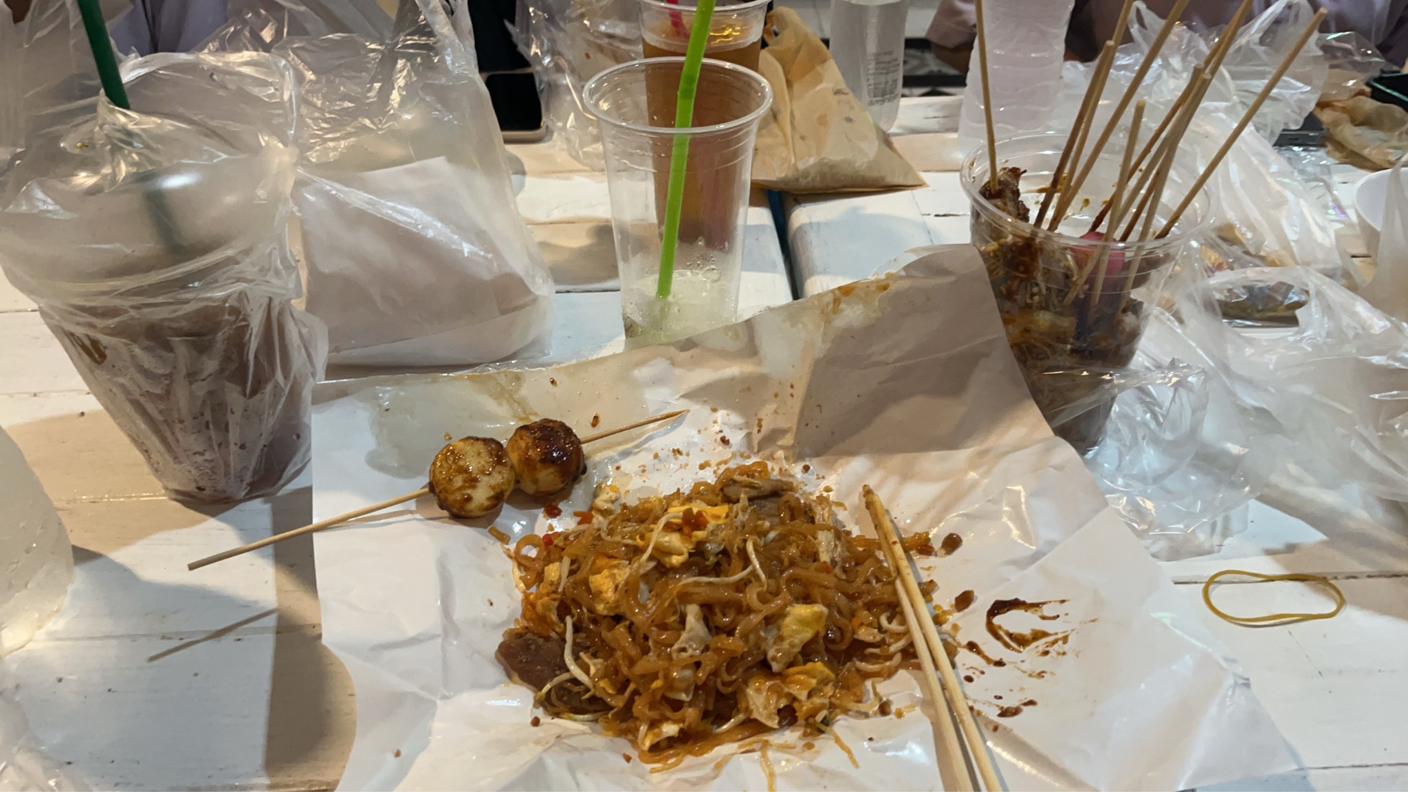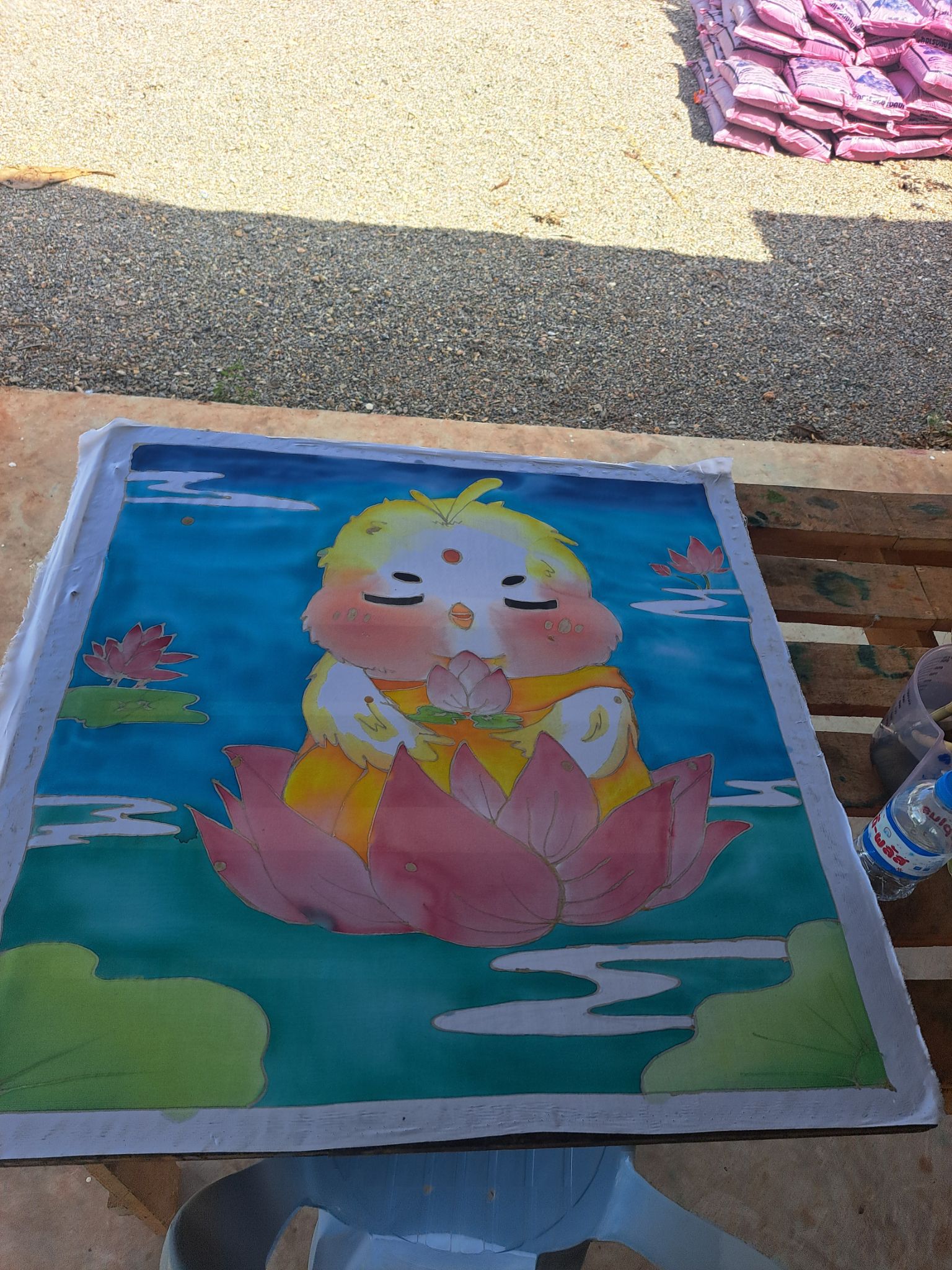 สำหรับกิจกรรมนี้พวกเราใช้เวลาไปเยอะเลยค่ะ เป็นกิจกรรมทำได้เรื่อยๆ ไม่ต้องเร่งรีบ แล้วทางร้านยังใจดีมีบริการน้ำดื่ม กาแฟ ขนมปั้นสิบเป็นของกินเล่นเพลินๆ ให้ฟรีอีกด้วย แล้วระหว่างที่เราทำไปก็จะมีลูกค้าคนอื่นๆ มาแวะเวียนดูพวกเราวาดรูปลงสีบ้าง ถามไถ่เรื่องจิปาถะบ้าง จนมาถึงช่วงเที่ยงก็ถึงเวลาพักหาของกินกัน ซึ่งตรงข้ามกับร้านผ้าบาติกมีร้านอาหารตามสั่งอยู่ จึงเดินข้ามถนนไปฝากท้องกันที่นั่นค่ะ หลังจากนั้นก็ซื้อของอุดหนุนร้านผ้าบาติกกันอีกสักเล็กน้อย ก่อนจะกลับกับรถสองแถวที่เราได้นัดเวลากันไว้