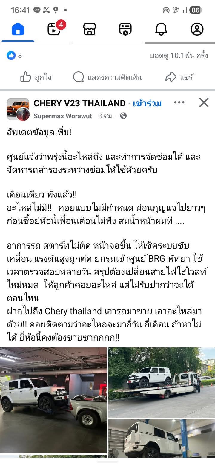 เจ้าของเรื่องฝากถึง Chery Thailand ว่า เมื่อทำตลาด และจำหน่ายรถยนต์แล้ว ควรจัดเตรียมอะไหล่สำรอง ให้เพียงพอ เพื่อไม่ให้ผู้บริโภคต้องประสบปัญหาการรอ ซ่อมเป็นระยะเวลานาน และหากไม่สามารถจัดหา อะไหล่ได้อย่างทันท่วงที อาจส่งผลต่อความเชื่อมั่น ของผู้ใช้ในระยะยาว