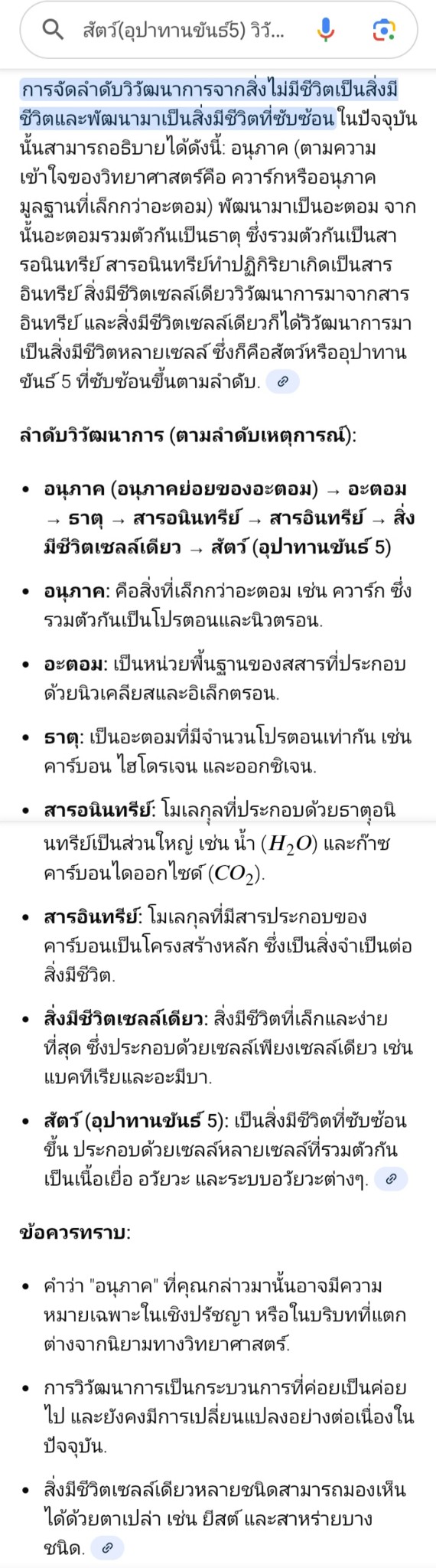 การจัดลำดับวิวัฒนาการจากสิ่งไม่มีชีวิตเป็นสิ่งมีชีวิตและพัฒนามาเป็นสิ่งมีชีวิตที่ซับซ้อนในปัจจุบันนั้นสามารถอธิบายได้ดังนี้: อนุภาค (ตามความเข้าใจของวิทยาศาสตร์คือ ควาร์กหรืออนุภาคมูลฐานที่เล็กกว่าอะตอม) พัฒนามาเป็นอะตอม จากนั้นอะตอมรวมตัวกันเป็นธาตุ ซึ่งรวมตัวกันเป็นสารอนินทรีย์ สารอนินทรีย์ทำปฏิกิริยาเกิดเป็นสารอินทรีย์ สิ่งมีชีวิตเซลล์เดียววิวัฒนาการมาจากสารอินทรีย์ และสิ่งมีชีวิตเซลล์เดียวก็ได้วิวัฒนาการมาเป็นสิ่งมีชีวิตหลายเซลล์ ซึ่งก็คือสัตว์หรืออุปาทานขันธ์ 5 ที่ซับซ้อนขึ้นตามลำดับ. ลำดับวิวัฒนาการ (ตามลำดับเหตุการณ์): อนุภาค (อนุภาคย่อยของอะตอม) → อะตอม → ธาตุ → สารอนินทรีย์ → สารอินทรีย์ → สิ่งมีชีวิตเซลล์เดียว → สัตว์ (อุปาทานขันธ์ 5)อนุภาค: คือสิ่งที่เล็กกว่าอะตอม เช่น ควาร์ก ซึ่งรวมตัวกันเป็นโปรตอนและนิวตรอน.อะตอม: เป็นหน่วยพื้นฐานของสสารที่ประกอบด้วยนิวเคลียสและอิเล็กตรอน.ธาตุ: เป็นอะตอมที่มีจำนวนโปรตอนเท่ากัน เช่น คาร์บอน ไฮโดรเจน และออกซิเจน.สารอนินทรีย์: โมเลกุลที่ประกอบด้วยธาตุอนินทรีย์เป็นส่วนใหญ่ เช่น น้ำ (\(H_{2}O\)) และก๊าซคาร์บอนไดออกไซด์ (\(CO_{2}\)).สารอินทรีย์: โมเลกุลที่มีสารประกอบของคาร์บอนเป็นโครงสร้างหลัก ซึ่งเป็นสิ่งจำเป็นต่อสิ่งมีชีวิต.สิ่งมีชีวิตเซลล์เดียว: สิ่งมีชีวิตที่เล็กและง่ายที่สุด ซึ่งประกอบด้วยเซลล์เพียงเซลล์เดียว เช่น แบคทีเรียและอะมีบา.สัตว์ (อุปาทานขันธ์ 5): เป็นสิ่งมีชีวิตที่ซับซ้อนขึ้น ประกอบด้วยเซลล์หลายเซลล์ที่รวมตัวกันเป็นเนื้อเยื่อ อวัยวะ และระบบอวัยวะต่างๆ. ข้อควรทราบ: คำว่า "อนุภาค" ที่คุณกล่าวมานั้นอาจมีความหมายเฉพาะในเชิงปรัชญา หรือในบริบทที่แตกต่างจากนิยามทางวิทยาศาสตร์.การวิวัฒนาการเป็นกระบวนการที่ค่อยเป็นค่อยไป และยังคงมีการเปลี่ยนแปลงอย่างต่อเนื่องในปัจจุบัน.สิ่งมีชีวิตเซลล์เดียวหลายชนิดสามารถมองเห็นได้ด้วยตาเปล่า เช่น ยีสต์ และสาหร่ายบางชนิด.