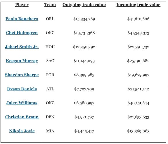 ตัวอย่างเช่น Keegan Murray มีค่าเหนื่อยฤดูกาล 2025-26 ที่ $11.1 ล้านเเต่ถ้าถูกเทรดจะนับรวมในเเคปทีมใหม่เพิ่มเป็น $25.1 ล้านเพราะเพิ่งต่อล่วงหน้า 5 ปี/$140 ล้าน
