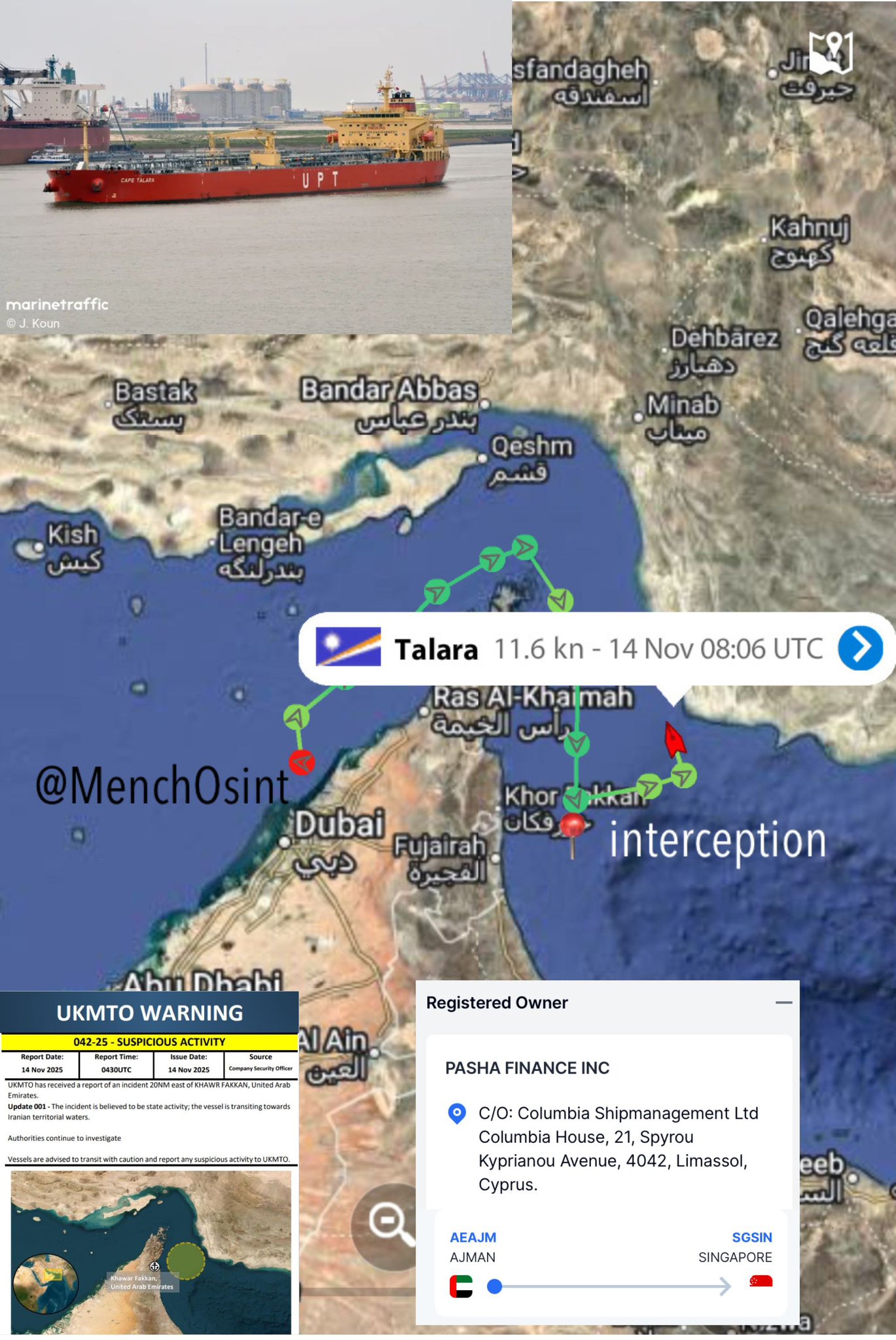 เรือกำลังขนน้ำมันจาก UAE ไปสิงคโปร์ แล้วโดนบังคับโดยเรือเร็วสามลำที่มีทหารหน่วยรบพิเศษ IRGC เข้าไปจอดที่ชายฝั่งอิหร่าน