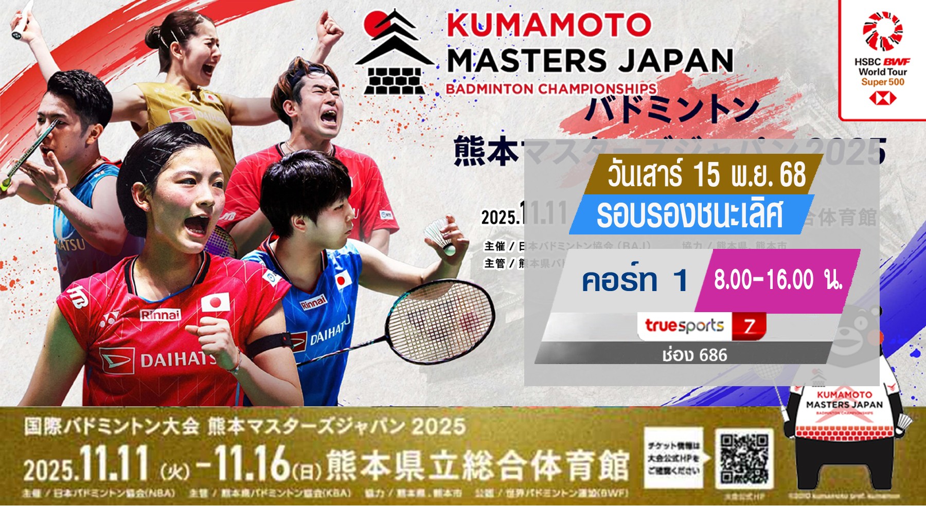 เชียร์สด ! แบดมินตันKumamotoMasters Japan 2025 : รอบรองชนะเลิศ (15 พ.ย. 68) (คู่แรก 8.00 น.)