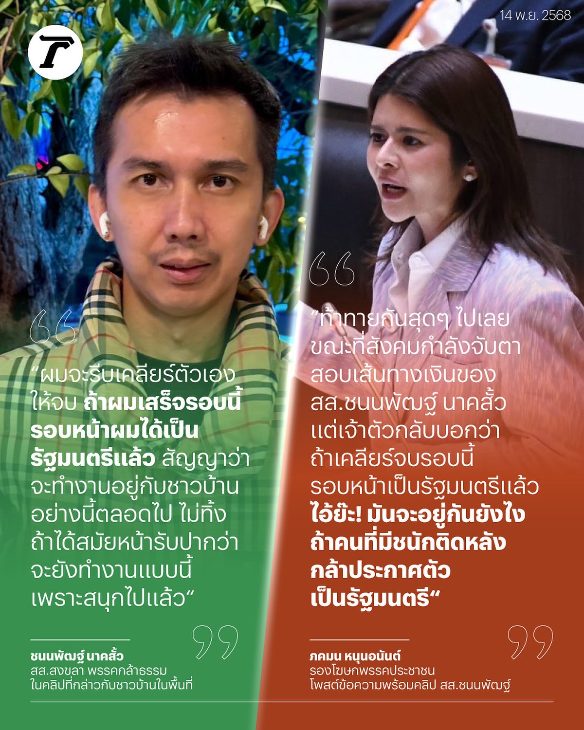 เมื่อเวลา 20.00 น. นางสาวภคมน หนุนอนันต์ สส.บัญชีรายชื่อ พรรคประชาชน โพสต์คลิปนายชนนพัฒฐ์ นาคสั้ว สส.สงขลา พรรคกล้าธรรม ที่กล่าวกับชาวบ้านที่มาให้กำลังใจในตอนหนึ่งว่า จะรีบเคลียร์ตัวเองให้จบ “ถ้าผมเสร็จรอบนี้ รอบหน้าผมได้เป็นรัฐมนตรี และสัญญาว่าจะทำงานอยู่กับชาวบ้านอย่างนี้ตลอดไป อยู่ใกล้ชิดกับทุกคนตลอดไปไม่ทิ้ง” นายชนนพัฒฐ์ กล่าวและว่า ถ้าได้เป็นสส.สมัยหน้าก็ยังจะทำงานแบบนี้ เพราะสนุกและมีความสุขที่ได้เที่ยวไปที่นั่นที ที่นี่ที