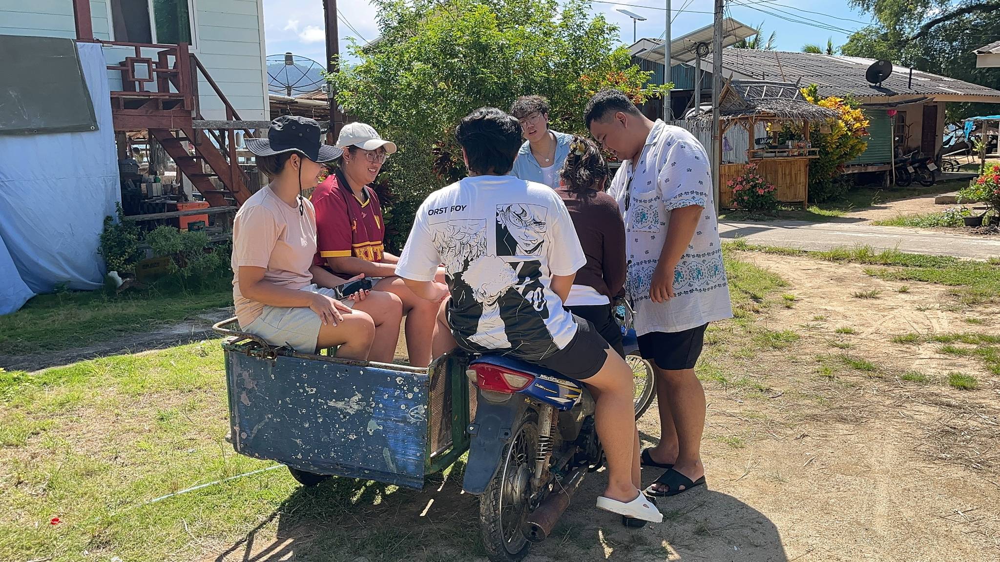 จนถึงเวลา 14.00 น. ซึ่งเป็นเวลาที่พวกเรานัดกันออกทัวร์รอบเกาะปอ เพื่อชมวิถีชีวิตและบรรยากาศของชุมชนท้องถิ่น พวกเรามีโอกาสได้ขี่ซาเล้ง เป็นการเปิดประสบการณ์ของเพื่อนหลาย ๆ คนทีเดียว