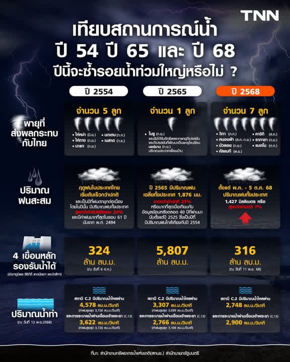 ข้อมูลจาก 4 เขื่อนหลัก พบว่า ปี 2554 เขื่อนรองรับน้ำได้ 324 ล้าน ลบ.ม. (วันที่ 6 ต.ค.), ปี 2565 รองรับได้ 5,807 ล้าน ลบ.ม., และปี 2568 รองรับได้ 316 ล้าน ลบ.ม. (วันที่ 11 พ.ย.) ส่วนปริมาณน้ำท่า (ข้อมูล ณ วันที่ 13 พ.ย. 2568) ระบุว่า ในปี 2568 ปริมาณน้ำไหลผ่าน 2,748 ลบ.ม./วินาที และการระบายน้ำผ่านเขื่อนเจ้าพระยาอยู่ที่ 2,900 ลบ.ม./วินาที