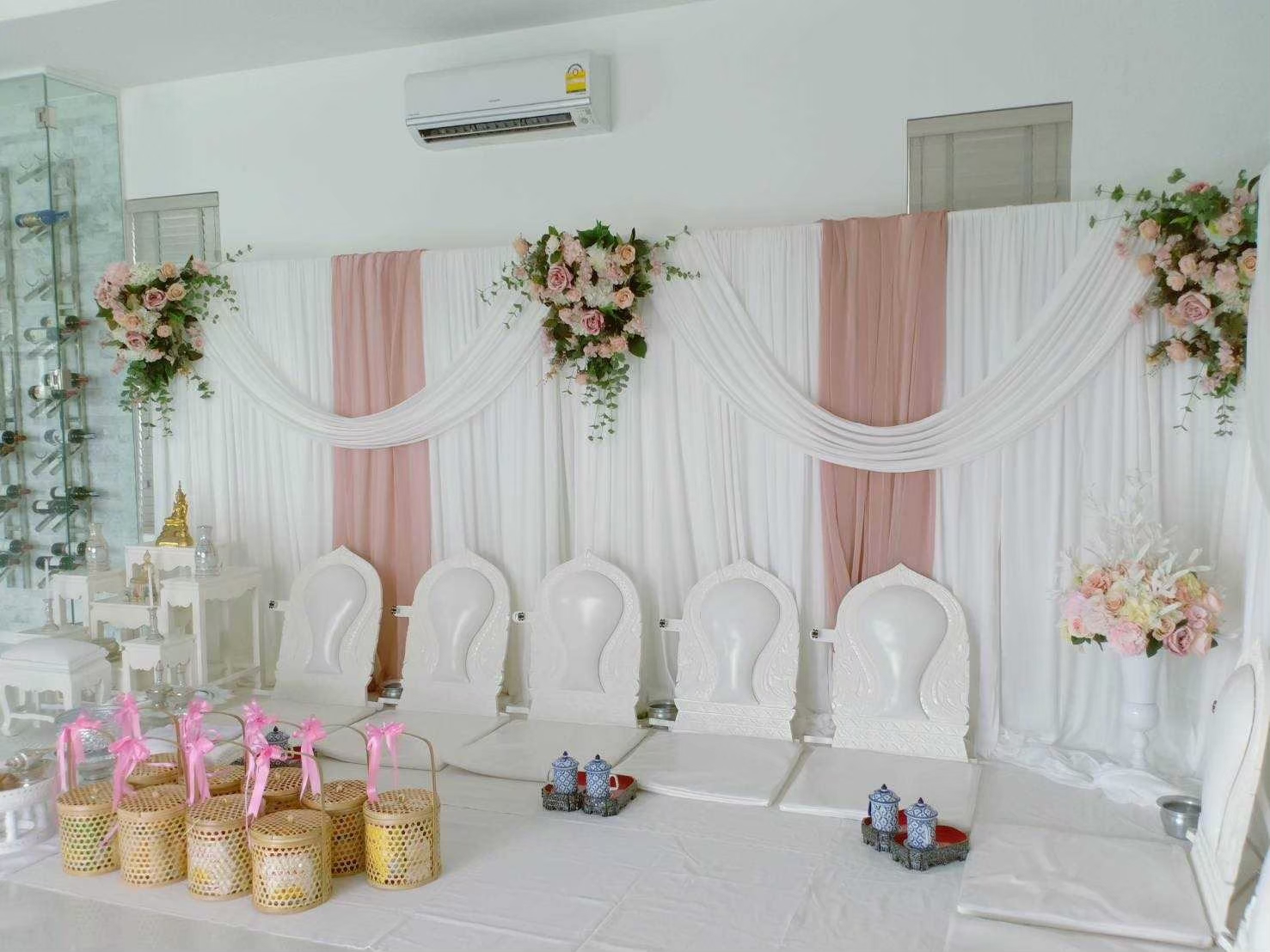A: สามารถจัดได้ 100% เพราะบริการของเรามีทั้งอุปกรณ์พิธี โต๊ะ เก้าอี้ พรมดอกไม้ และอาหารครบชุด ลูกค้าไม่จำเป็นต้องเตรียมเอง