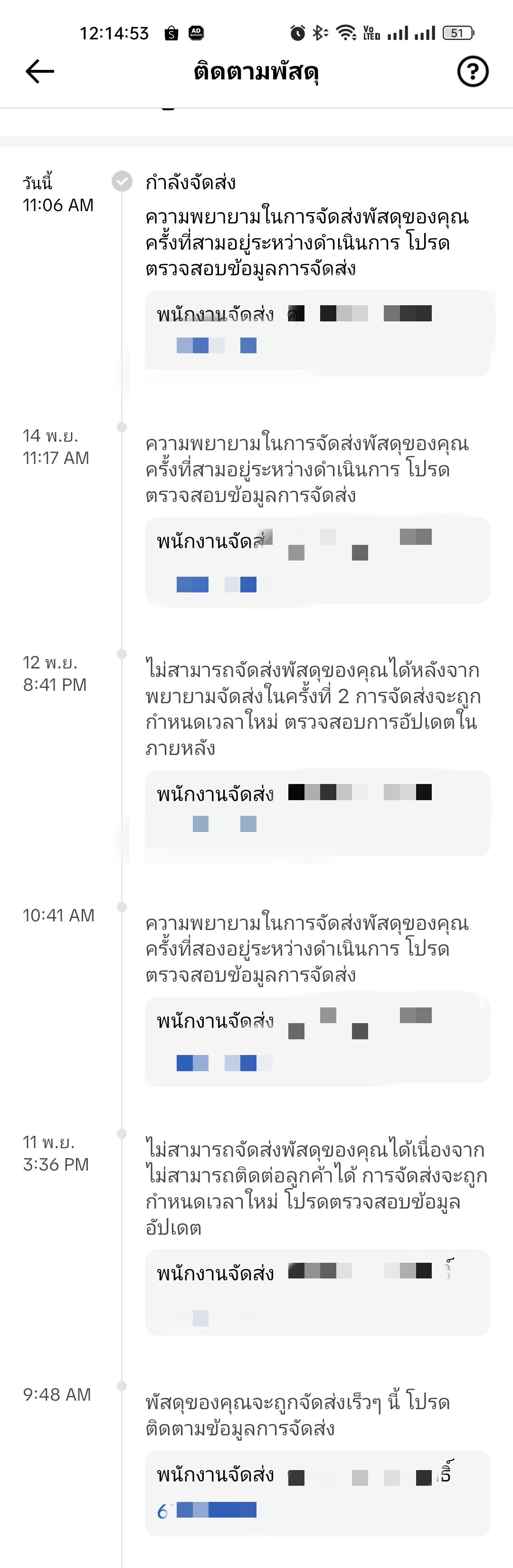 โดยเรื่องของเรื่องคือเราสั่งของจากttค่ะ โดยล่าสุดขนส่งน่าจะมาส่งของวันที่ 11/11/68 ที่ผ่านมา แต่ทางเราไม่ได้รับเนื่องจากติดงานค่ะไม่ได้พกโทรศัพท์ไปด้วย แต่คือปกติขนส่งอื่นถ้าวันนี้คนสั่งยังไม่รับหรือติดต่อไม่ได้พรุ่งนี้เขาก็จะส่งใหม่ใช่ไหมค่ะ แต่ทั้งนี้คือวันที่ 11 มาส่งไม่ได้ก็เลยคิดว่าวันที่ 12 เขาก็น่าจะมาส่งอีก แต่พอวันที่ 12 เราก็รอทั้งวันก็ไม่มีใครติดต่อมา ก็เลยรอดูงั้นวันที่ 13 ต้องมาแล้วแหละ รอไปเกือบเย็นก็ยังไม่มีใครโทรมาเราก็เลยโทรกลับไปก็ไม่มีคนรับอีก(เราโทรไปหาพนักงานโดยตรงเลยเพราะว่าถ้าเวลาจะมีของมาส่งมันจะมีชื่อกับเบอร์โทรของพนักงานขึ้นไว้ให้ แล้วก็รอวันที่ 14 รอทั้งวันก็ไม่มีใครโทรมาโทรไปอีกก็ไม่มีใครรับ คือแบบรู้สึกโมโหมากคือสั่งของตั้งแต่วันที่ 4 จนตอนนี้วันที่ 15 ก็ยังไม่ได้ของ อยากรู้ว่าเขาจัดการระบบกันยังไงทำไมถึงส่งข้ามวันขนาดนั้น